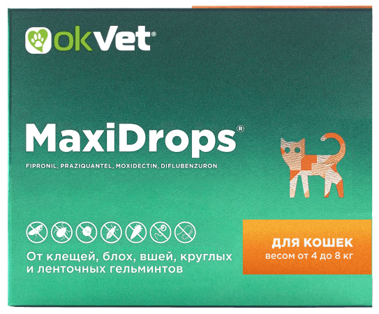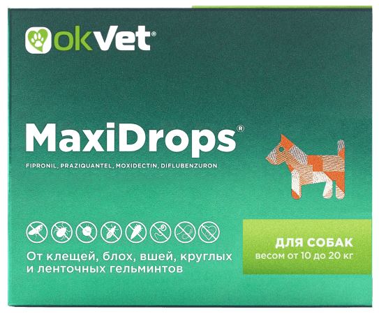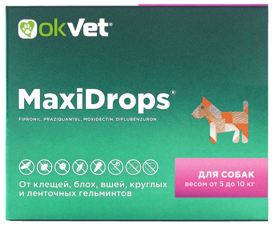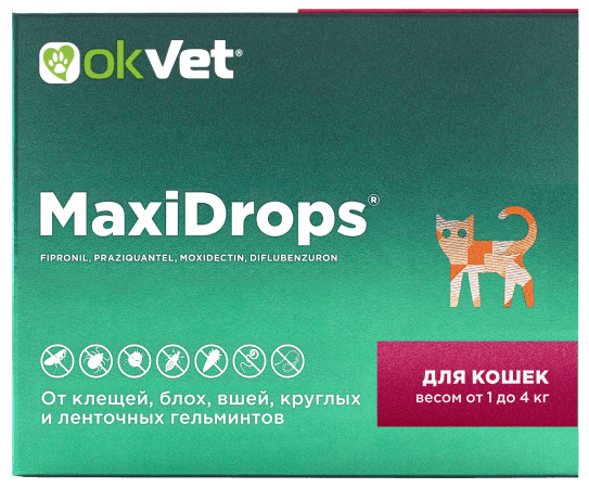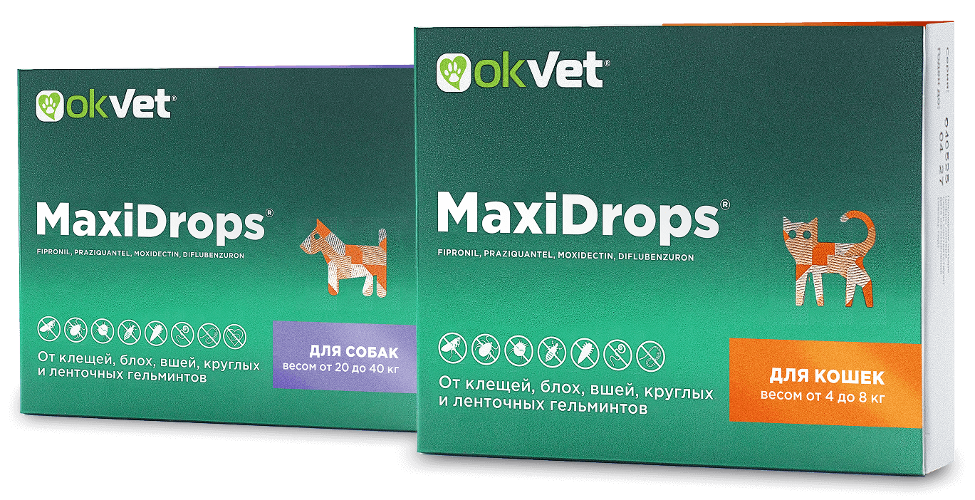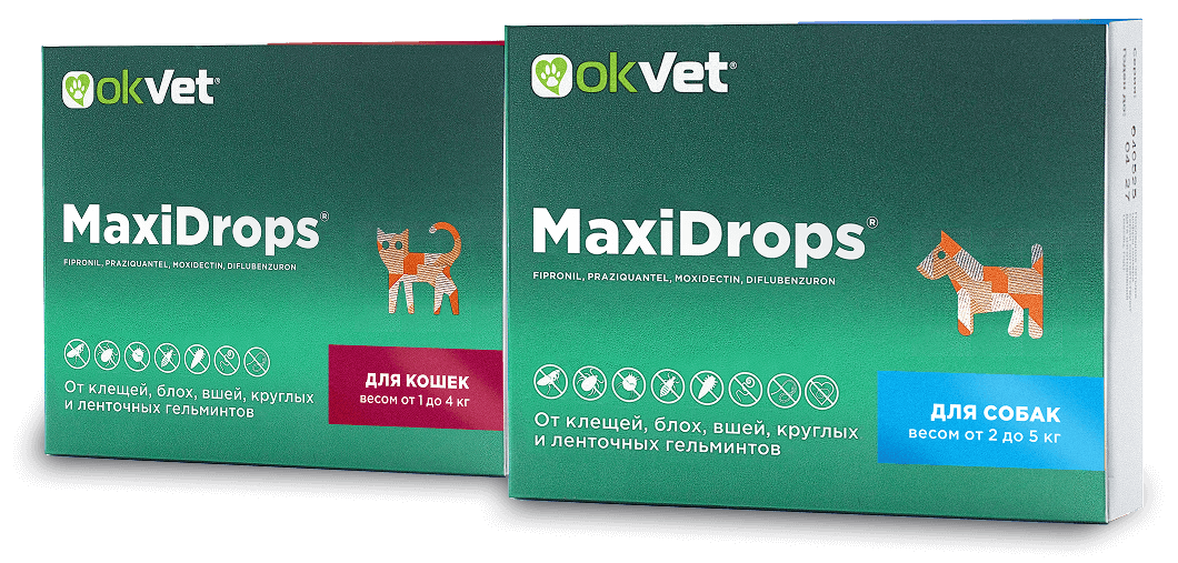 - Согласно инструкции по применению, препарат MaxiDrops® эффективен против 37 видов эктопаразитов и гельминтов, включая дирофилярии у собак, и против 28 видов у кошек.