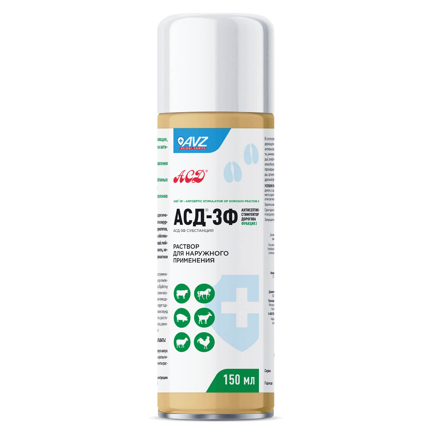 АСД®-3Ф – Антисептик-стимулятор Дорогова фракция 3 назначают крупному и мелкому рогатому скоту, лошадям, свиньям и сельскохозяйственной птице для лечения свежих ран травматического и хирургического происхождения, дерматитов, хронических воспалительных заболеваний кожи, трофических язв, свищей, гнойных ран, болезней копыт и копытец, некробактериоза, а также профилактики и лечения вольфартиоза.