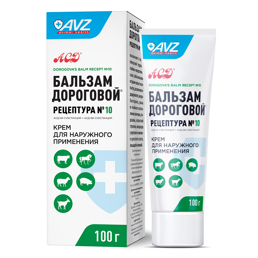 Бальзам ДОРОГОВОЙ® рецептура № 10 в 100 г содержит в качестве действующих веществ АСД-2Ф субстанцию – 5 г и АСД-3Ф субстанцию – 5 г и вспомогательные вещества: масло оливковое, масло касторовое, глицерин, экстракт ромашки, экстракт календулы, карбомер натрия, метилпарабен, пропилпарабен и воду очищенную.