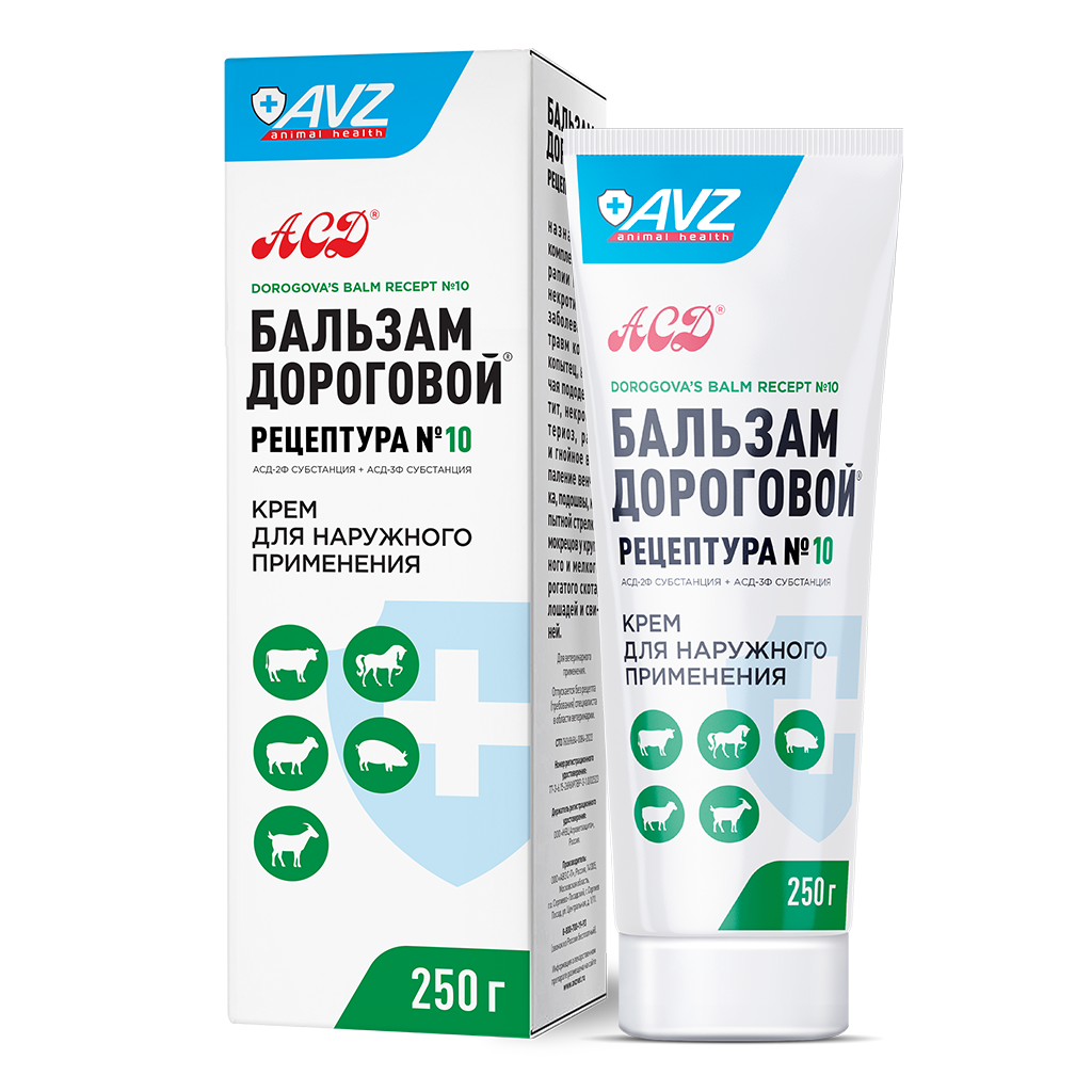 Бальзам ДОРОГОВОЙ® рецептура № 10 в 100 г содержит в качестве действующих веществ АСД-2Ф субстанцию – 5 г и АСД-3Ф субстанцию – 5 г и вспомогательные вещества: масло оливковое, масло касторовое, глицерин, экстракт ромашки, экстракт календулы, карбомер натрия, метилпарабен, пропилпарабен и воду очищенную.