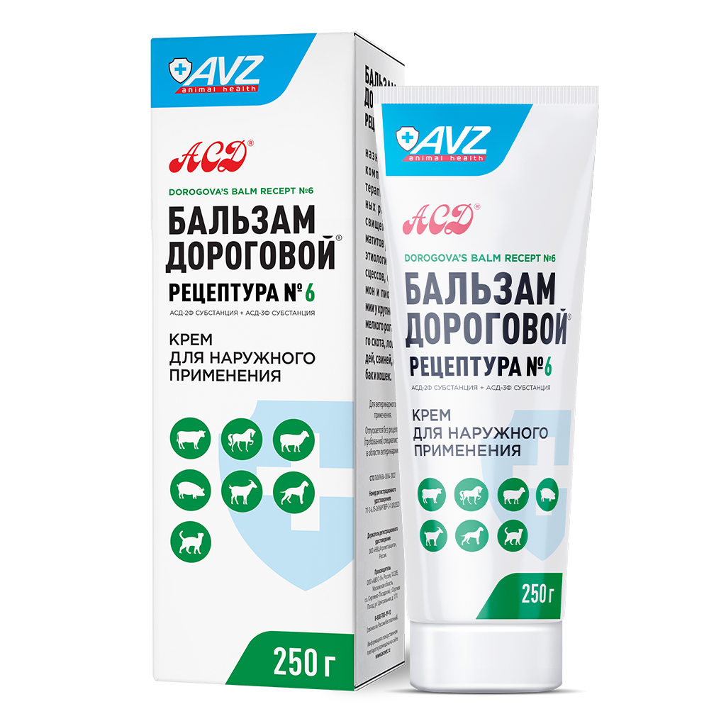 Бальзам ДОРОГОВОЙ® рецептура № 6 в 100 г содержит в качестве действующих веществ АСД-2Ф субстанцию – 3 г и АСД-3Ф субстанцию – 3 г и вспомогательные вещества: масло оливковое, масло касторовое, глицерин, экстракт ромашки, экстракт календулы, карбомер натрия, метилпарабен, пропилпарабен и воду очищенную.