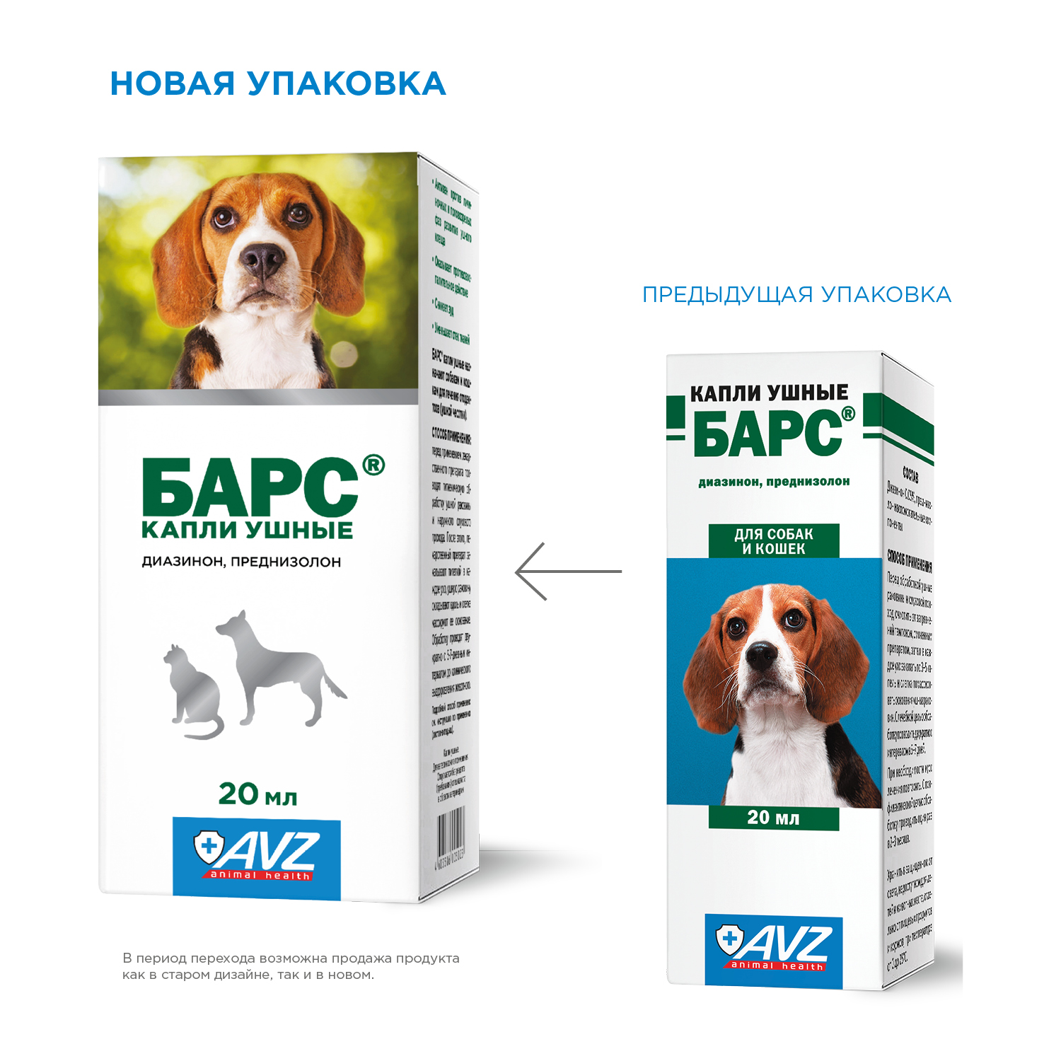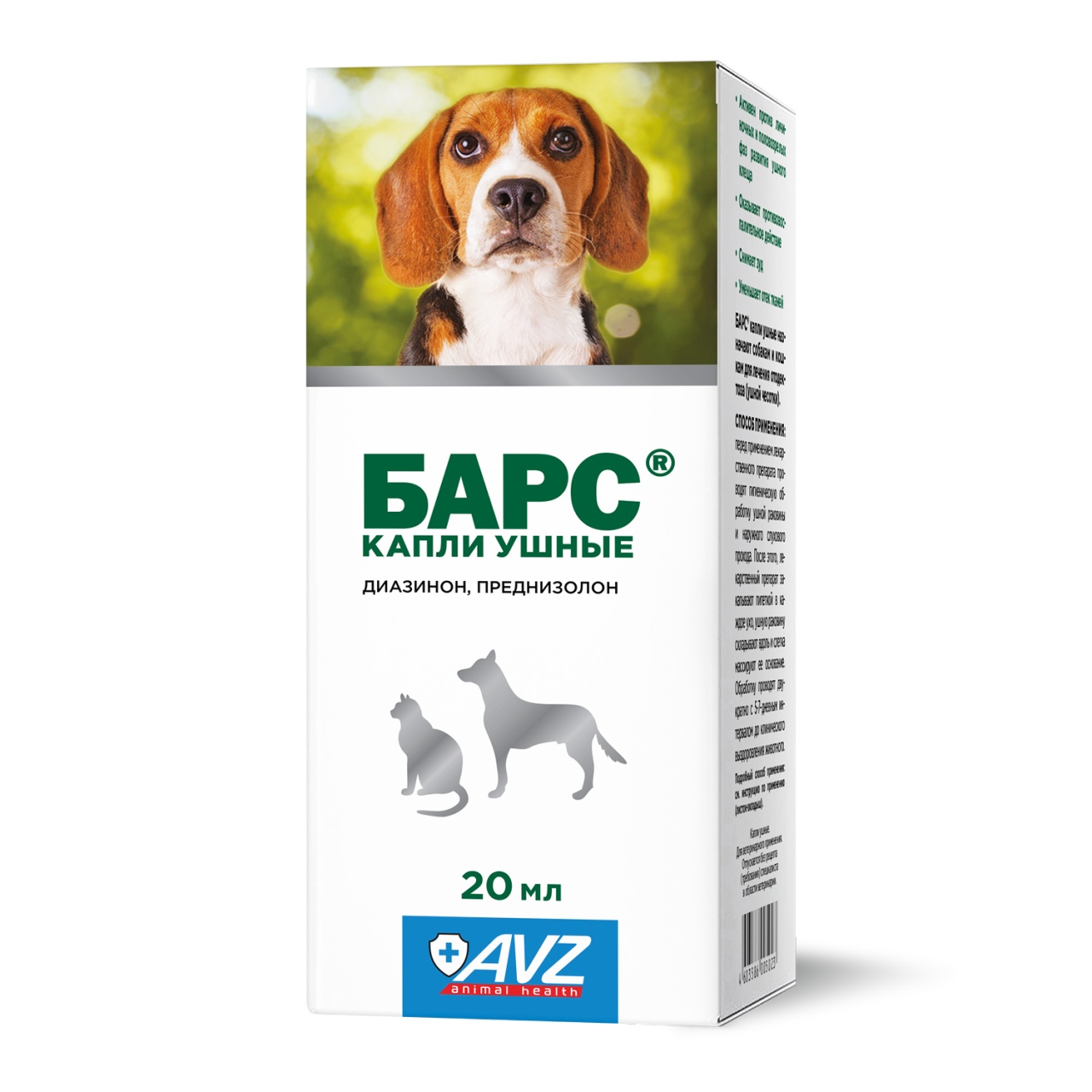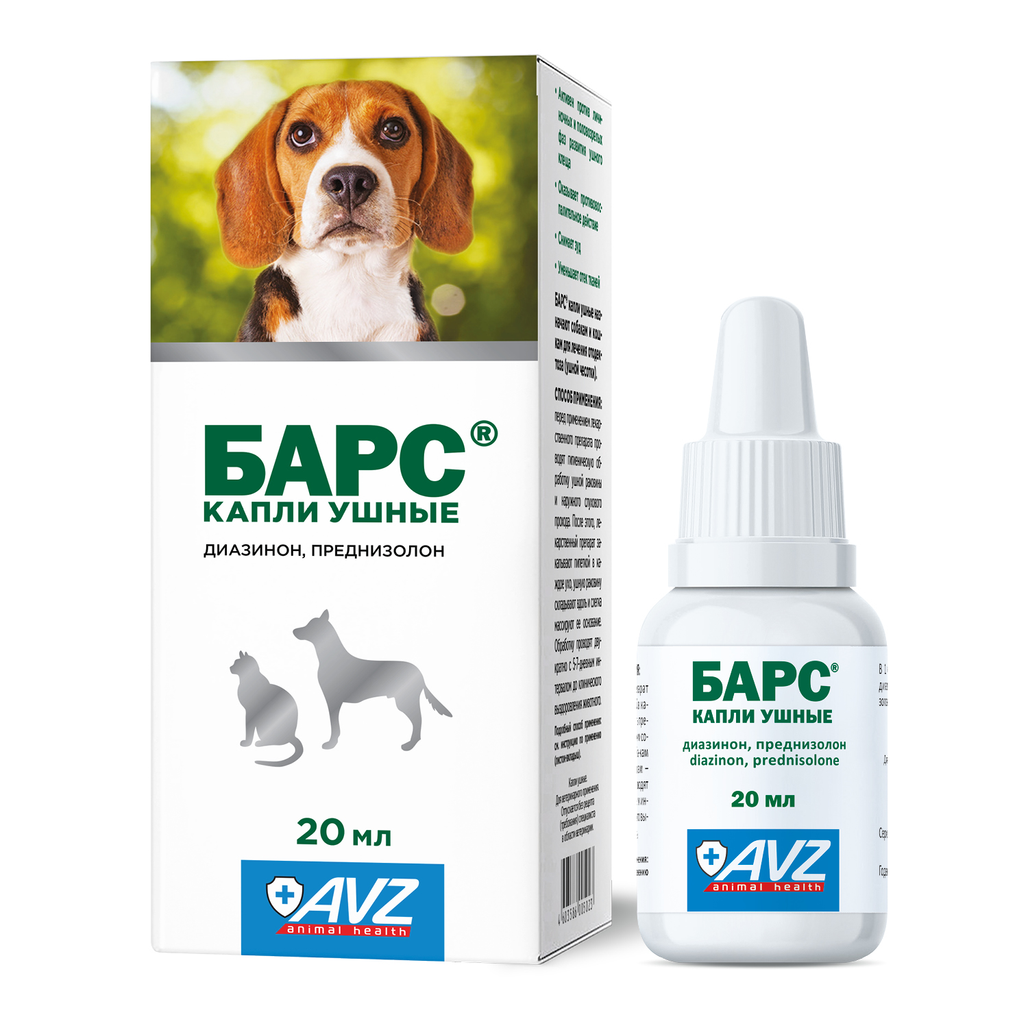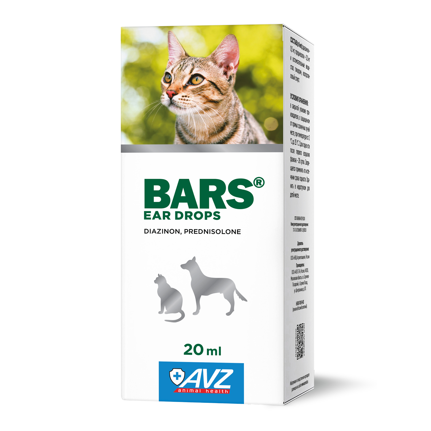 БАРС® капли ушные в 1 мл в качестве действующих веществ содержит диазинон - 0,5 мг и преднизолон - 0,3 мг, а в качестве вспомогательных веществ: глицерин и спирт изопропиловый.