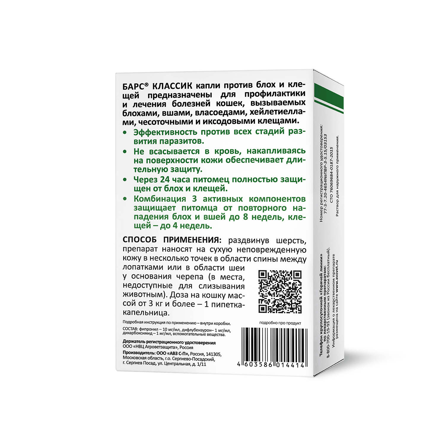 БАРС® классик капли против блох и клещей назначают кошкам для лечения и профилактики энтомозов (вши, блохи, власоеды), саркоптоза, нотоэдроза, отодектоза, хейлетиеллеза, поражении иксодовыми клещами.
