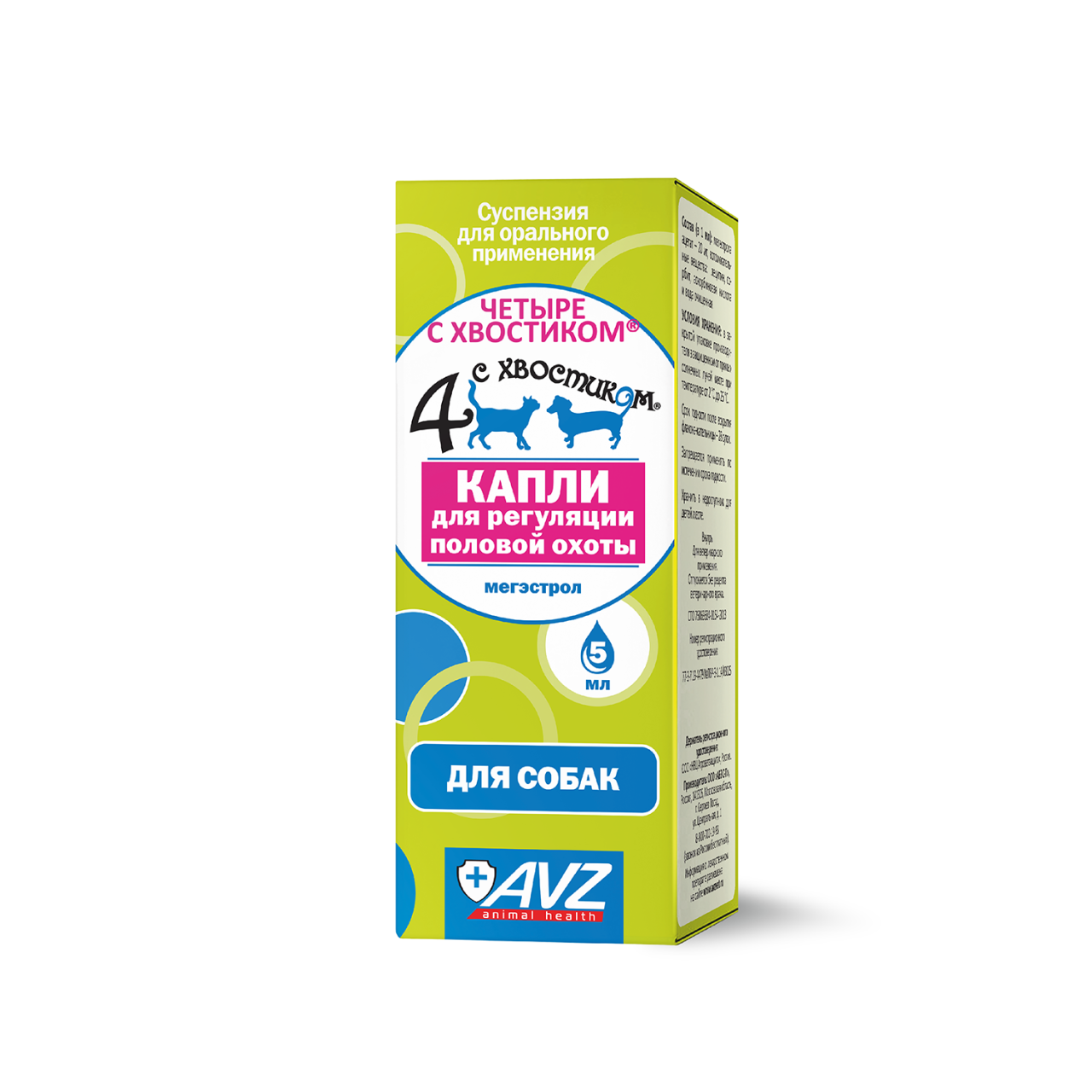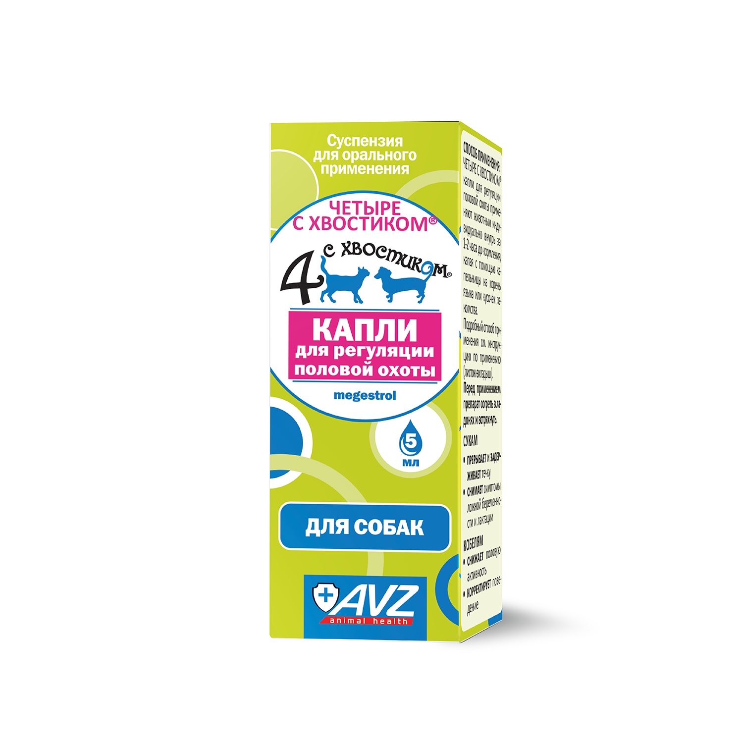 «Четыре с хвостиком» капли для регуляции половой охоты и таблетки применяют сукам для задержки и прерывания течки, а также кобелям для снижения половой активности и коррекции поведения.
