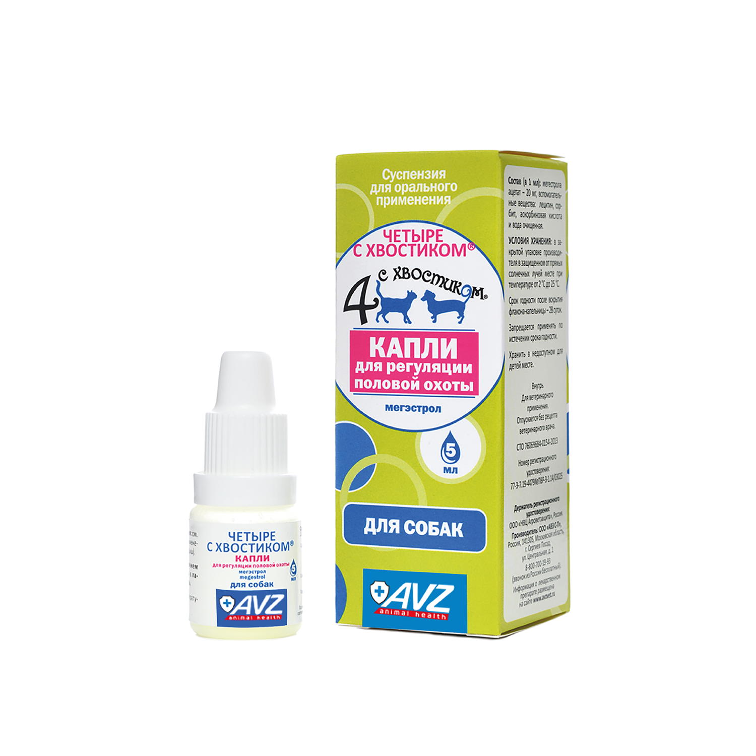 «Четыре с хвостиком» капли для регуляции половой охоты в 1 мл содержит в качестве действующего вещества мегестрола ацетат – 20 мг.