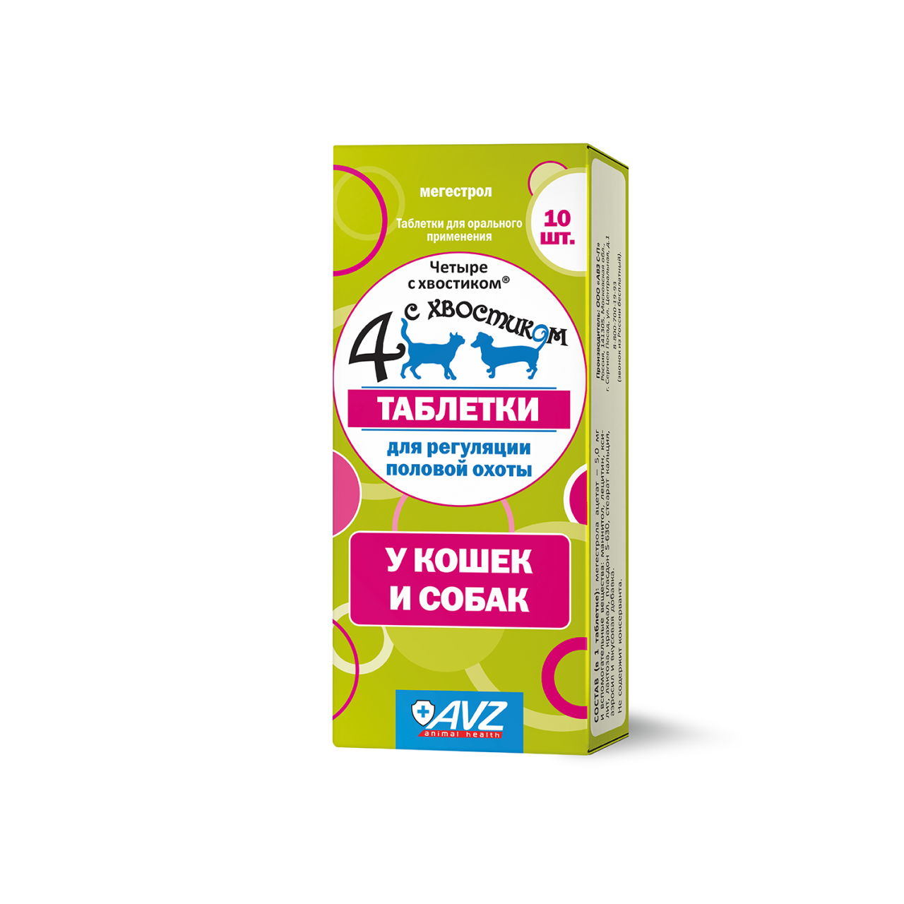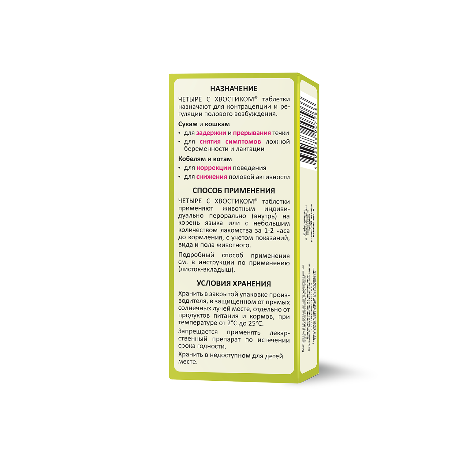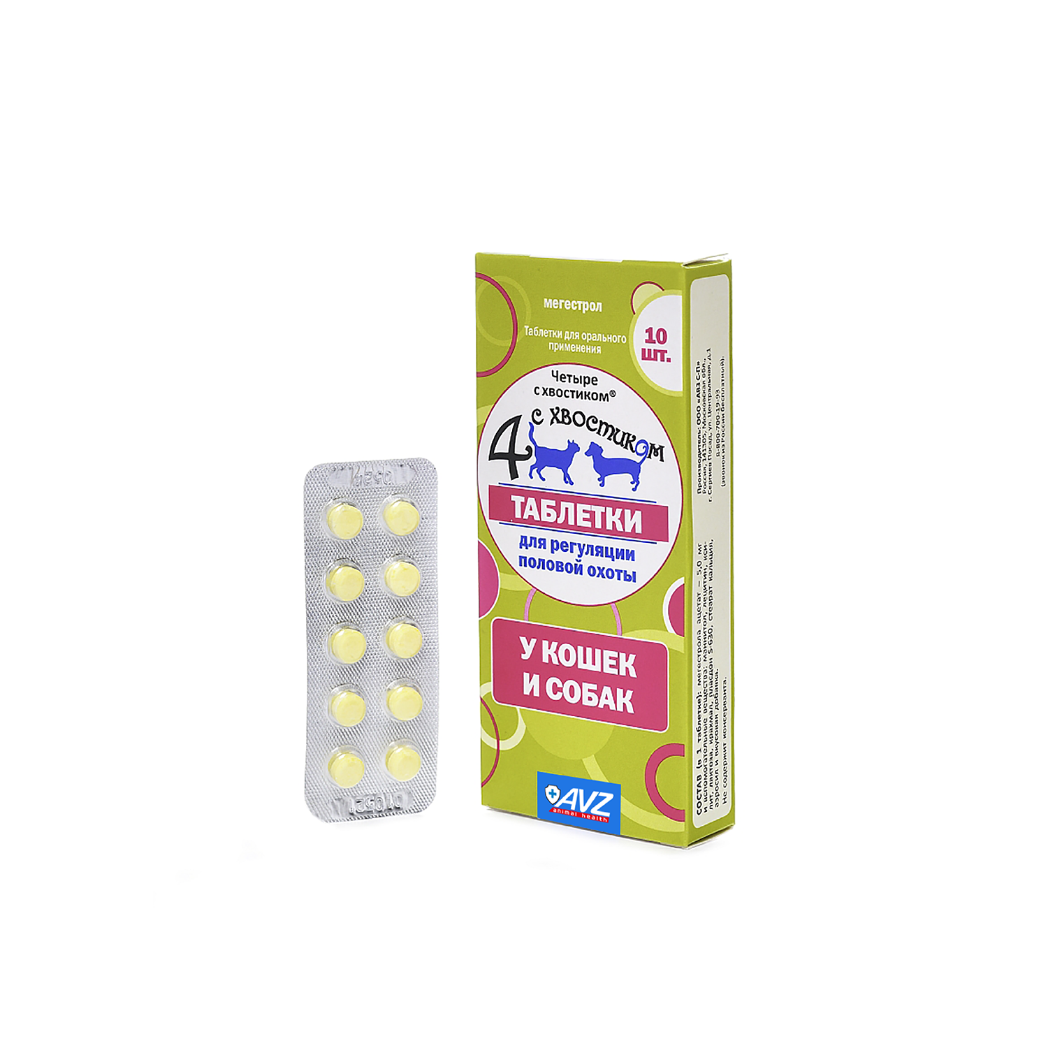 "Четыре с хвостиком" таблетки назначают для контрацепции и регуляции полового возбуждения: сукам и кошкам - для задержки, прерывании течки, снятия симптомов ложной беременности и лактации, кобелям и котам - для снижения половой активности и коррекции поведения.