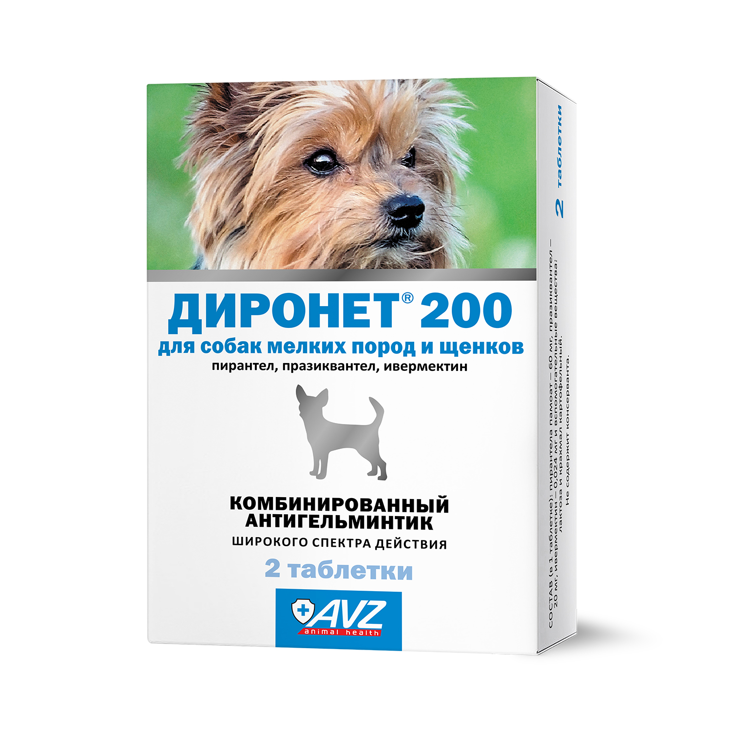 ДИРОНЕТ® 200 предназначен для собак, содержит в одной таблетке пирантела памоата 60 мг, празиквантела 20 мг и ивермектина 0,024 мг. ДИРОНЕТ® относится к комбинированным антигельминтным лекарственным препаратам широкого спектра действия. Комбинация входящих в состав препарата действующих веществ обеспечивает широкий спектр его антигельминтного действия на все фазы развития круглых и ленточных гельминтов, паразитирующих у собак, в том числе Toxocara canis, Т. cati, Toxascaris leonina, Uncinaria stenocephala, Ancylostoma caninum, Trichuris vulpis, Echinococcus granulosus, E. multilocularis, Diphyllobothrium latum, Dipylidium caninum, Multiceps multiceps, Taenia spp., а также личиночных фаз развития (микрофилярий) Dirofilaria immitis и D. repens.