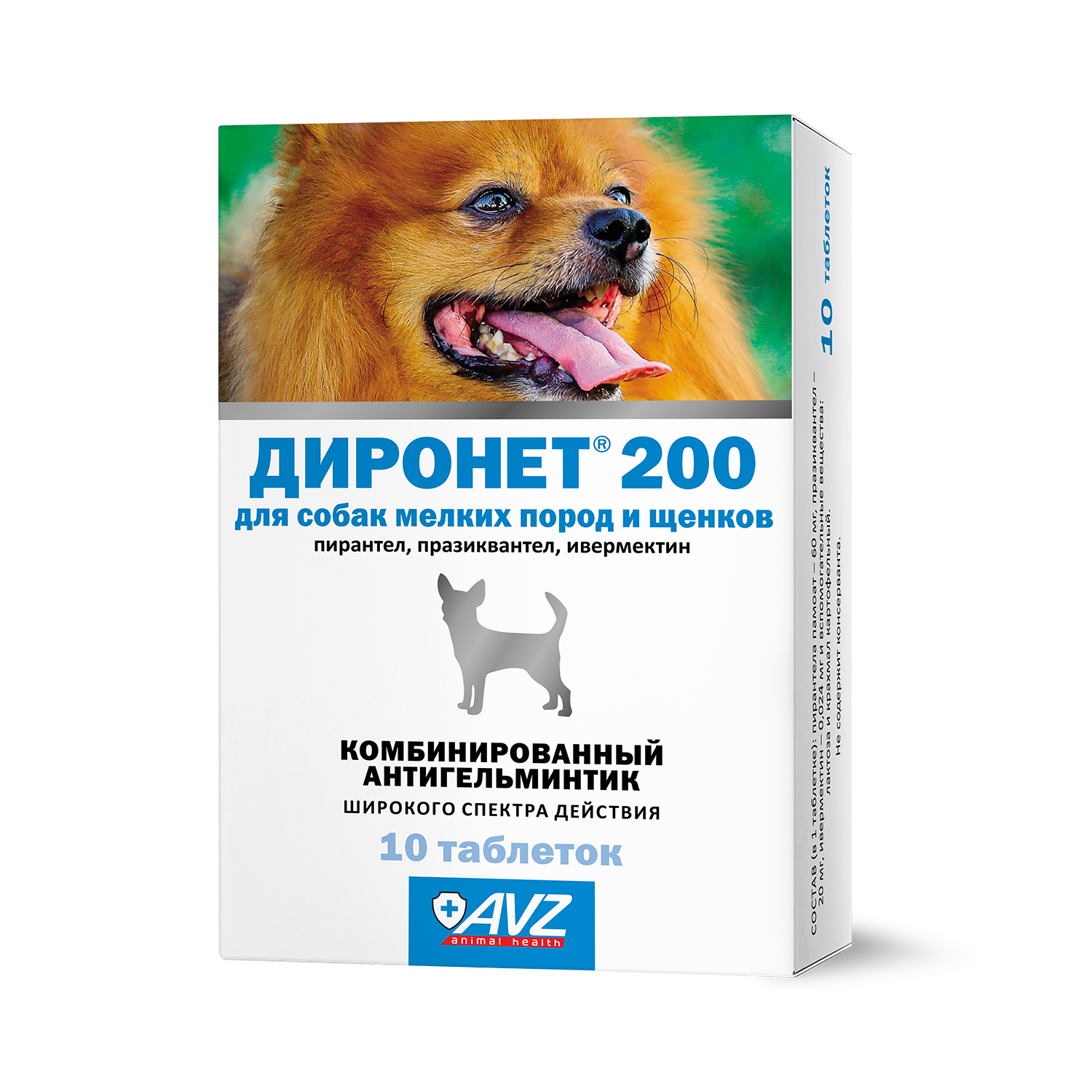 ДИРОНЕТ® 200 предназначен для собак, содержит в одной таблетке пирантела памоата 60 мг, празиквантела 20 мг и ивермектина 0,024 мг. ДИРОНЕТ® относится к комбинированным антигельминтным лекарственным препаратам широкого спектра действия. Комбинация входящих в состав препарата действующих веществ обеспечивает широкий спектр его антигельминтного действия на все фазы развития круглых и ленточных гельминтов, паразитирующих у собак, в том числе Toxocara canis, Т. cati, Toxascaris leonina, Uncinaria stenocephala, Ancylostoma caninum, Trichuris vulpis, Echinococcus granulosus, E. multilocularis, Diphyllobothrium latum, Dipylidium caninum, Multiceps multiceps, Taenia spp., а также личиночных фаз развития (микрофилярий) Dirofilaria immitis и D. repens.
