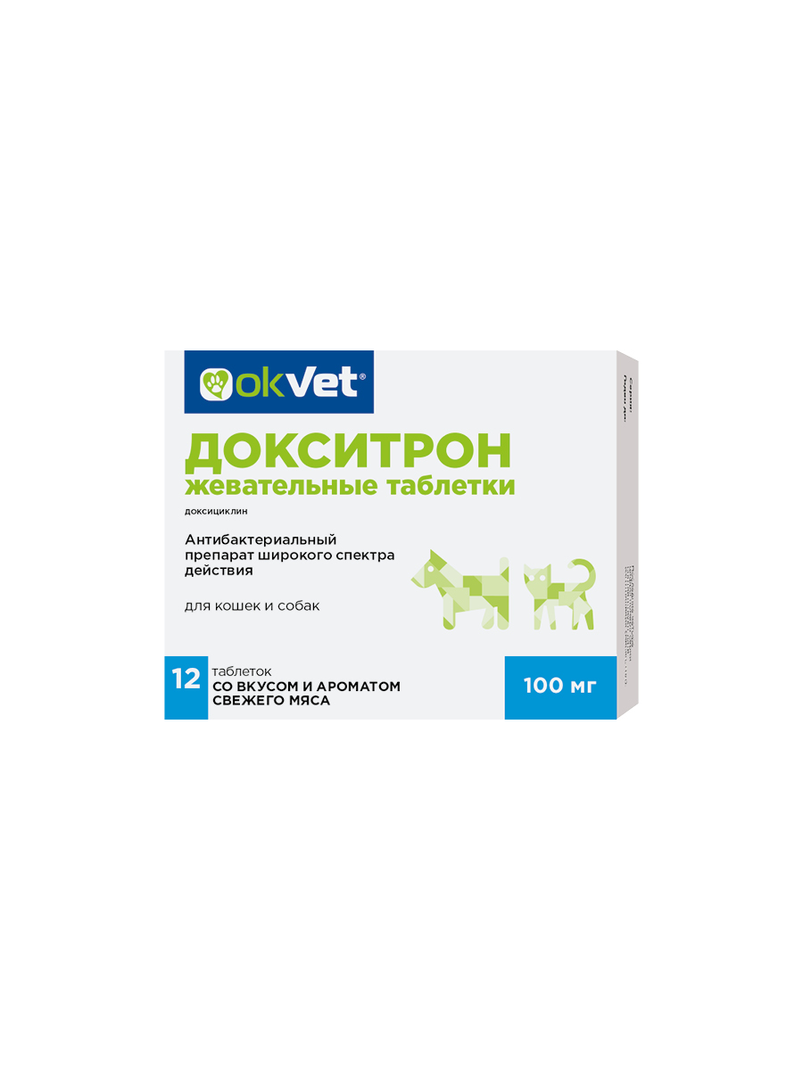 Докситрон жевательные таблетки содержит в качестве действующего вещества доксициклин (в форме гиклата) - в одной таблетке 20 мг, а также вспомогательные вещества: лактозу, целлюлозу микрокристаллическую, крахмал картофельный, стеарат кальция, кремния диоксид коллоидный, добавку со вкусом и ароматом свежего мяса.