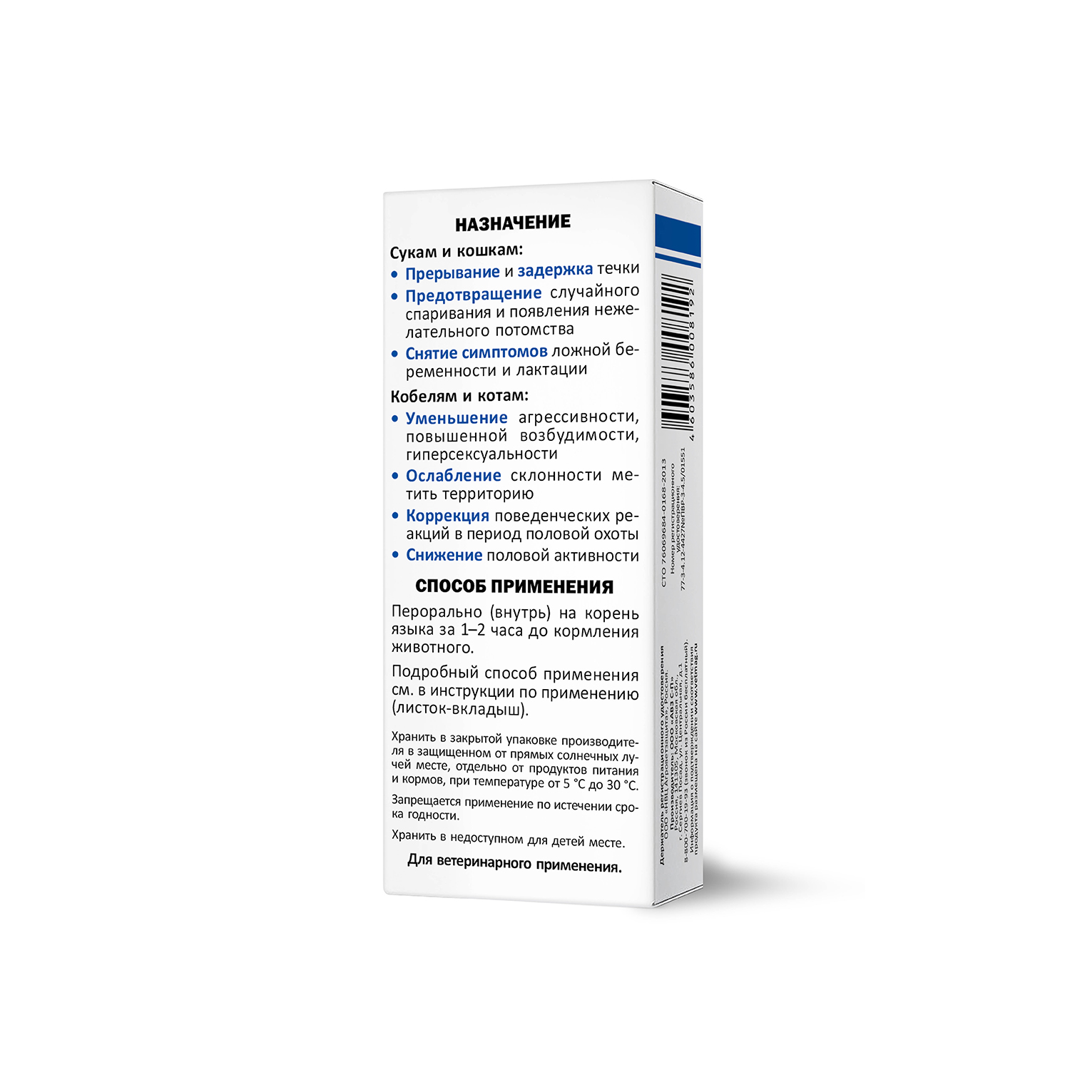Для снижения половой активности кобелей и коррекции их нежелательного поведения (мечение мочой в помещении, повышенная возбудимость) средства применяют ежедневно в дозе 2 мг мегестрола ацетата на килограмм массы животного в течение недели. Далее, при наличии положительного результата, продолжают использовать половинную суточную дозу в течение 2 недель.