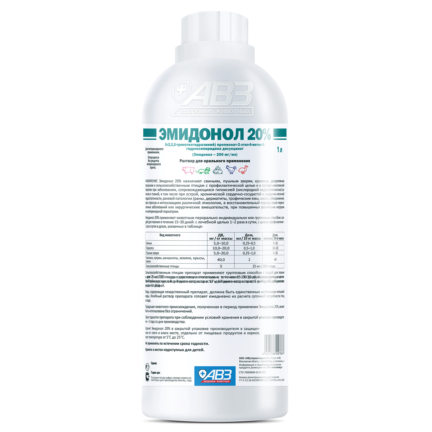 "Эмидонол 20%" назначают свиньям, сельскохозяйственной птице, кроликам, пушным зверям и нутриям с профилактической целью и в составе комплексной терапии при заболеваниях, сопровождающихся гипоксией органов и тканей, в том числе при острой, хронической сердечно-сосудистой и сердечно-легочной недостаточности, раневой патологии, при стрессах и интоксикациях различной этиологии, в восстановительный период после перенесенных заболеваний или хирургических вмешательств, при повышенных физических нагрузках. Препарат повышает конверсию кормов, способствует увеличению привесов. В свиноводстве препарат используют для повышения продуктивности и оплодотворяемости животных, лечения дисфункции молочных желез, профилактики и терапии стресса при перевозке и скученности животных, а также для увеличения жизнеспособности молодняка. В промышленном птицеводстве препарат используют для профилактики и лечения стресса, вызванного резким изменением параметров микроклимата (повышения температуры воздуха, увеличение содержания аммиака и т.д.), скученным содержанием птицы и изменением рациона, а также при остром и хроническом отравлении микотоксинами.Противопоказания.