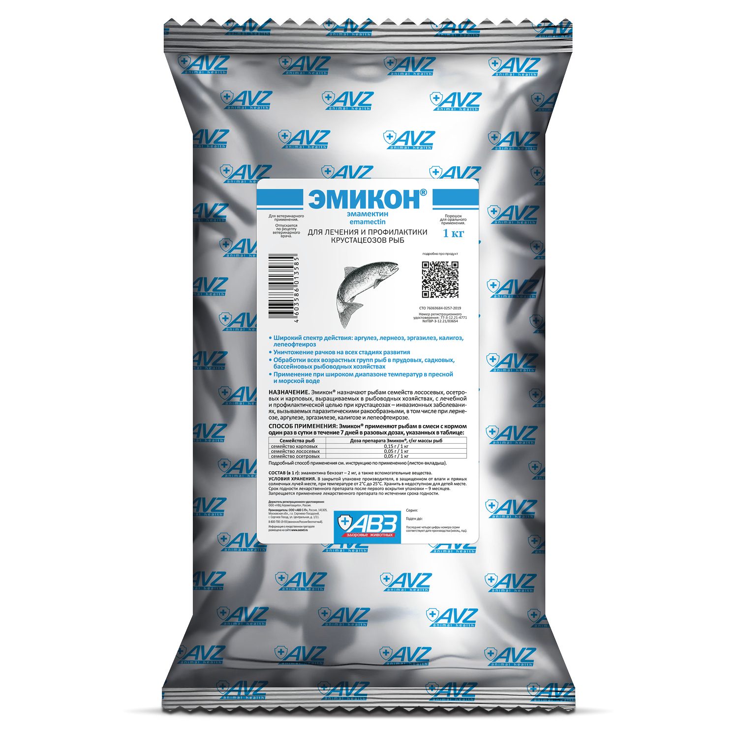 Входящий в состав препарата эмамектина бензоат – соединение класса макроциклических лактонов, обладает системным противопаразитарным действием в отношении паразитических ракообразных на всех стадиях развития. Паразитирующие у рыб семейств лососевых, осетровых и карповых ракообразные, в том числе Lernaea spp., Argulus spp., Ergasilus sieboldi, Ergasilus briani, Caligus spp., Lepeophtheirus salmonis, внедряясь в кожные покровы, жабры, плавники, глаза, другие органы и ткани, вызывают отставание в темпе роста и гибель рыб, на фоне резко выраженных клинических симптомов инвазии, ухудшают товарный вид и пищевые качества рыбной продукции.