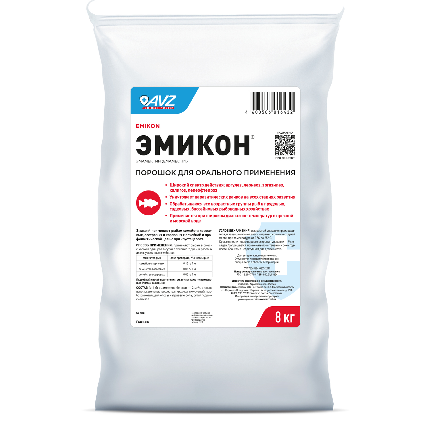 Входящий в состав препарата эмамектина бензоат – соединение класса макроциклических лактонов, обладает системным противопаразитарным действием в отношении паразитических ракообразных на всех стадиях развития. Паразитирующие у рыб семейств лососевых, осетровых и карповых ракообразные, в том числе Lernaea spp., Argulus spp., Ergasilus sieboldi, Ergasilus briani, Caligus spp., Lepeophtheirus salmonis, внедряясь в кожные покровы, жабры, плавники, глаза, другие органы и ткани, вызывают отставание в темпе роста и гибель рыб, на фоне резко выраженных клинических симптомов инвазии, ухудшают товарный вид и пищевые качества рыбной продукции.