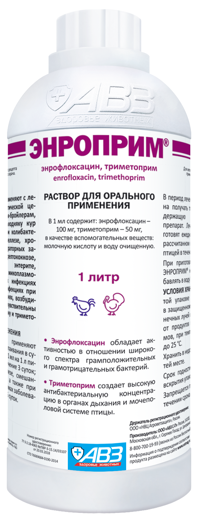 В качестве действующих веществ 1 мл препарата содержит энрофлоксацин – 100 мг и триметоприм – 50 мг. Энрофлоксацин - антибиотик группы фторхинолонов, обладает активностью в отношении Escherichia coli, Haemophikus spp., Pasteurella spp., Salmonella spp., Staphylococcus spp., Streptococcus spp., Clostridium perfringens, Bordetella spp., Campylobacter spp., Corynebacterium pyogenes., Pseudomonas aeruginosa, а также Mycoplasma spp. Триметоприм является производным соединением из группы диаминопиримидинов, обладает широким спектром антибактериального действия, активен в отношении Escherichia coli, Klebsiella spp., Salmonella spp., Enterobacter spp., Proteus spp., Shigella spp., Haemophilus spp. и Chlamidia.