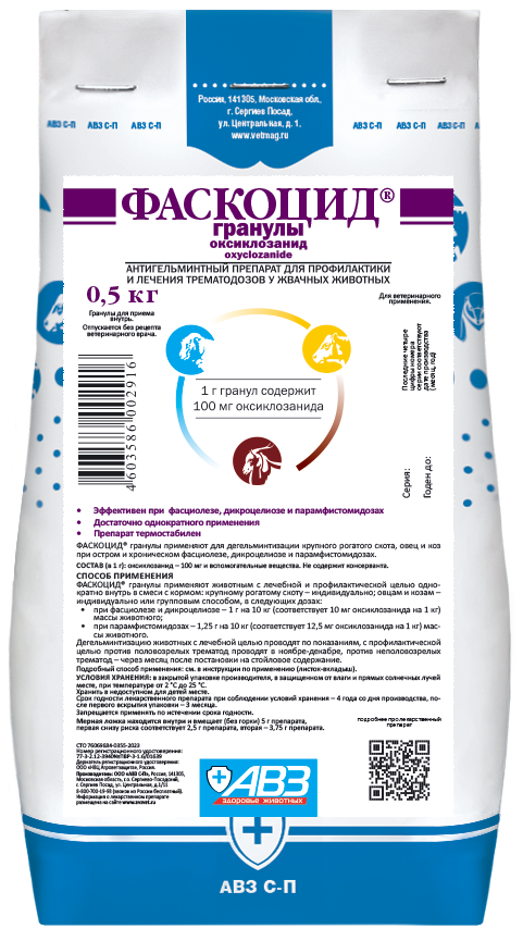 ФАСКОЦИД® гранулы в 1 г в качестве действующего вещества содержат оксиклозанид – 100 мг.