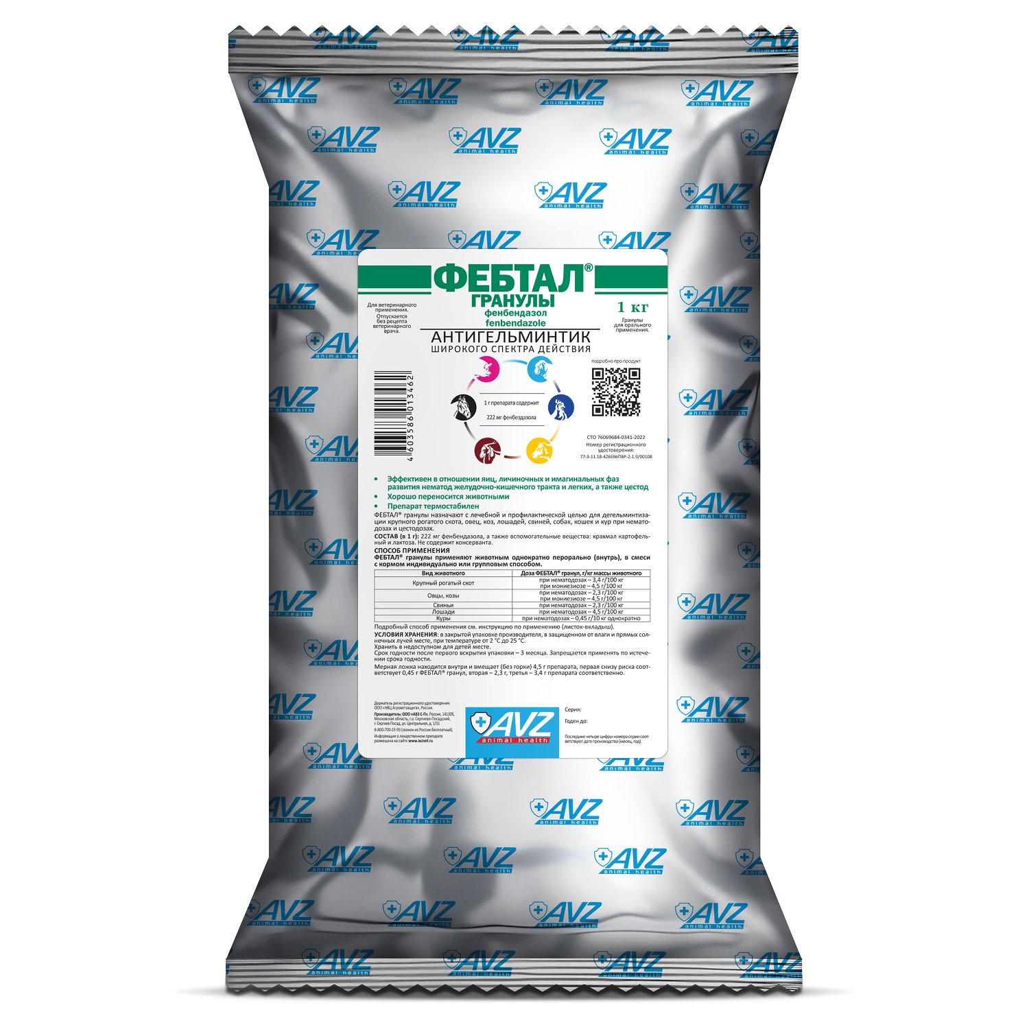 Фенбендазол (5-фенил-тио-2-бензимидазол карбамат), входящий в состав препарата – соединение группы бензимидазола, обладает широким спектром нематодоцидного и цестодоцидного действия, активен в отношении взрослых и личиночных форм нематод желудочно-кишечного тракта и легких, а также цестод и простейших Giardia spp., паразитирующих у животных.
