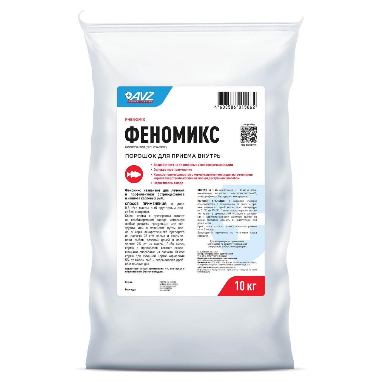 Входящий в состав лекарственного препарата никлозамид обладает выраженным цестодоцидным действием на все фазы развития ленточных гельминтов, паразитирующих в кишечнике рыб.