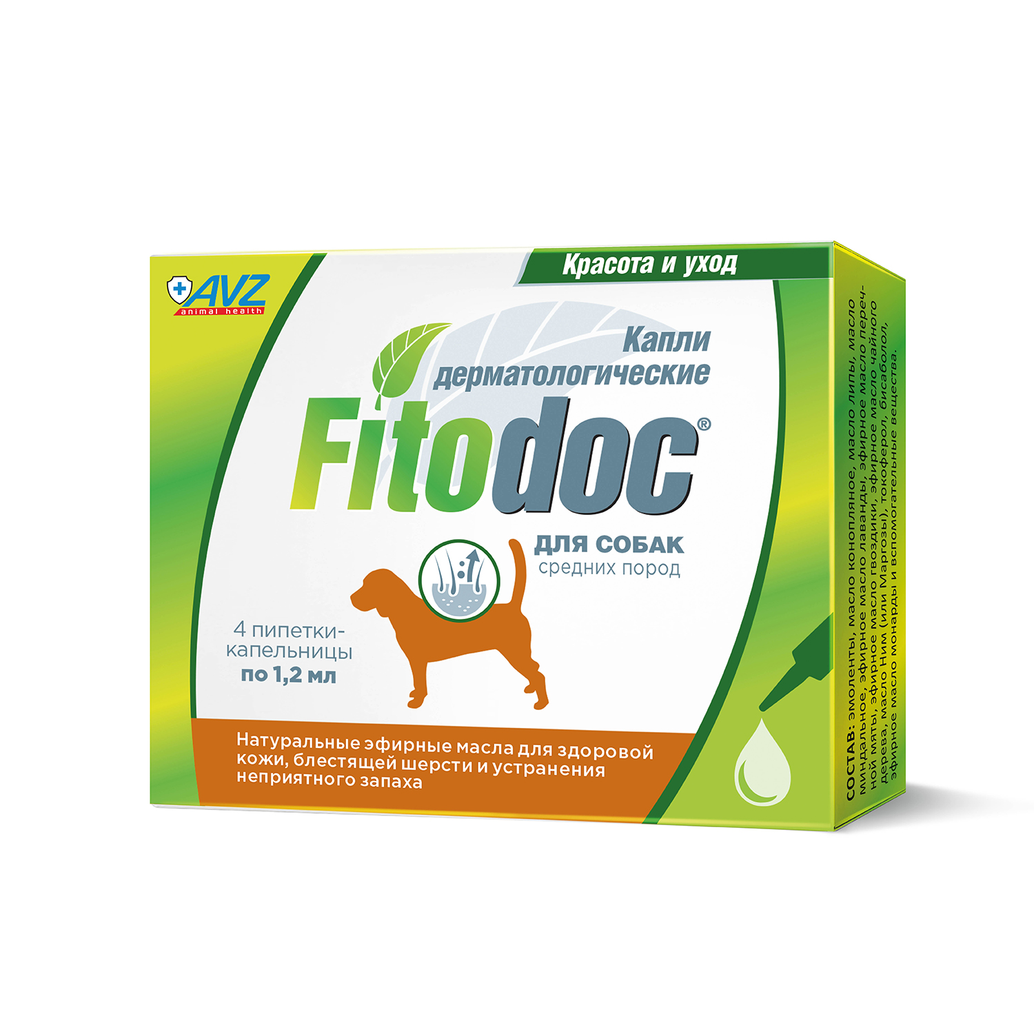 В качестве зоокосметических ингредиентов капли FITODOC® содержат: эмоленты, масло конопляное, масло липы, масло миндальное, эфирное масло лаванды, эфирное масло перечной мяты, эфирное масло гвоздики, эфирное масло чайного дерева, масло ним (или маргозы), токоферол, бисаболол, эфирное масло монарды и вспомогательные вещества.Капли FITODOC® эффективно устраняют неприятный запах шерсти, сохраняя обоняние животного, уменьшают зуд и раздражение кожи. Зоокосметическое действие обусловлено комплексом сбалансированно подобранных эмолентов, способствующих равномерному распределению активных ингредиентов по поверхности кожного покрова и их лучшему проникновению в глубокие слои эпидермиса, не закупоривая при этом поры и не всасываясь в кровь. После нанесения капли FITODOC® восстанавливают структуру и стимулируют обменные процессы в эпидермисе, эффективно увлажняют кожу на поверхности и в глубоких слоях эпидермиса. Восполняют потребность в незаменимых жирных кислотах (омега-3 и омега-6).