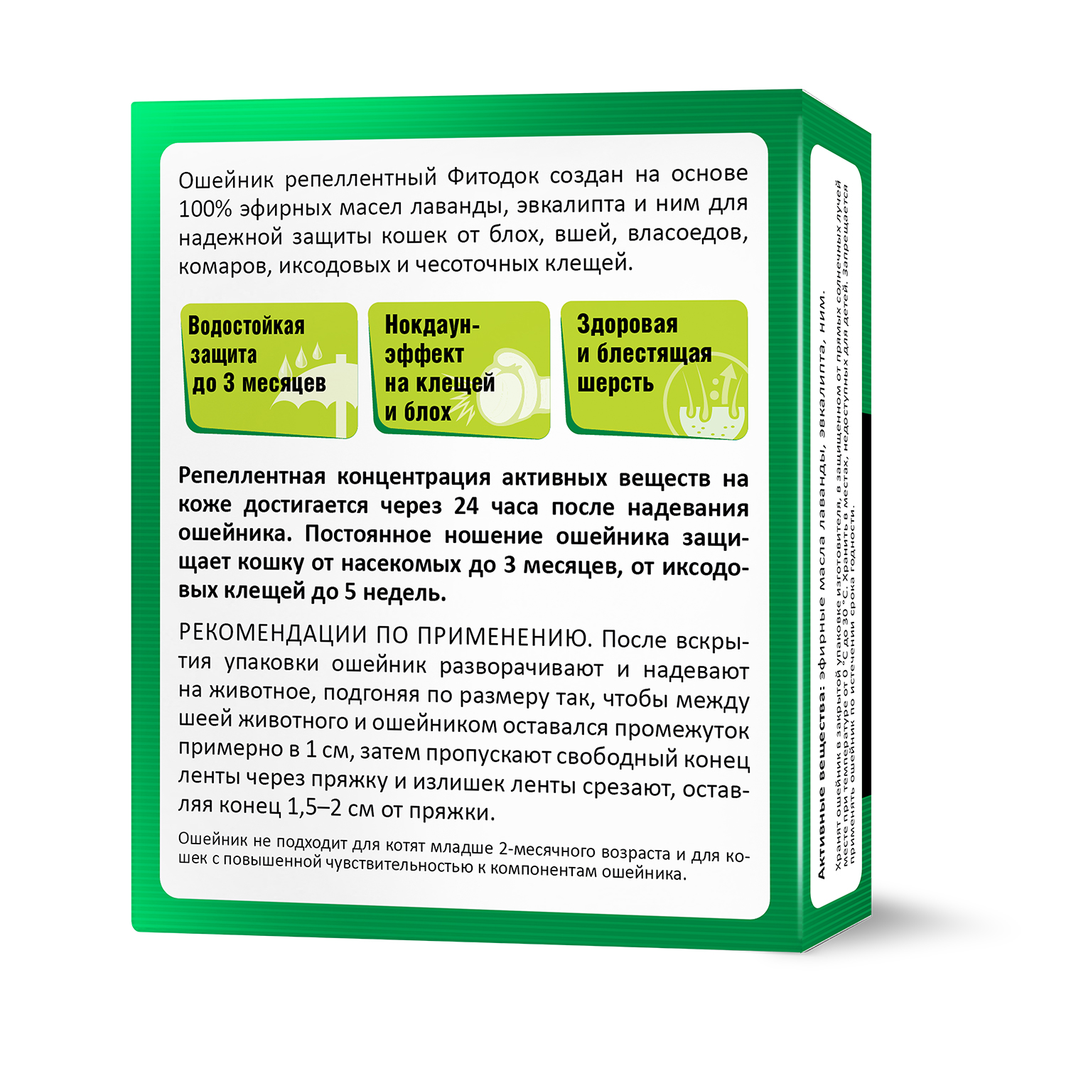 В качестве активных веществ ошейник содержит композицию эфирных масел: лаванды, эвкалипта, маргозы (ним) и вспомогательные вещества. Ошейник создан на основе 100% эфирных масел, обладает выраженным репеллентным действием для надежной защиты кошек от блох, вшей, власоедов, комаров, иксодовых и чесоточных клещей.