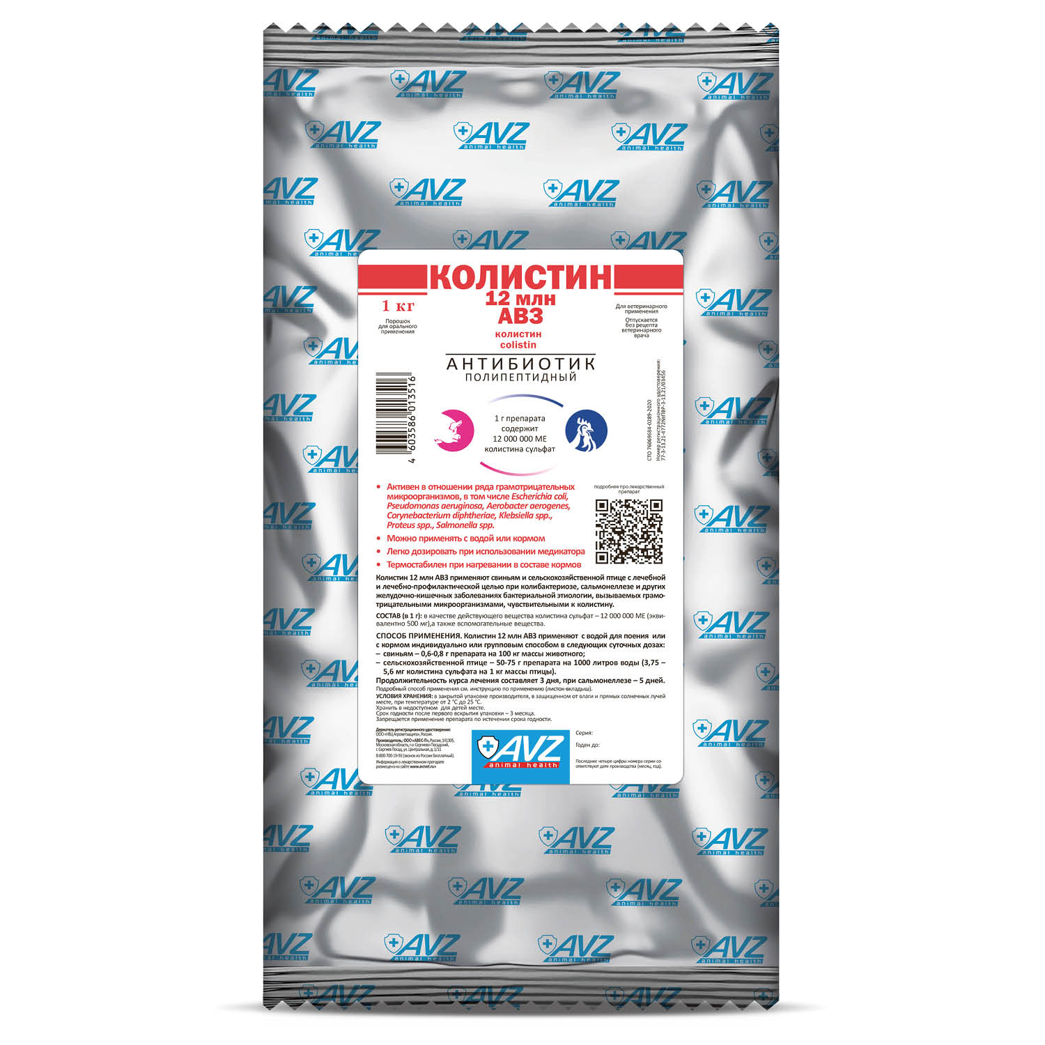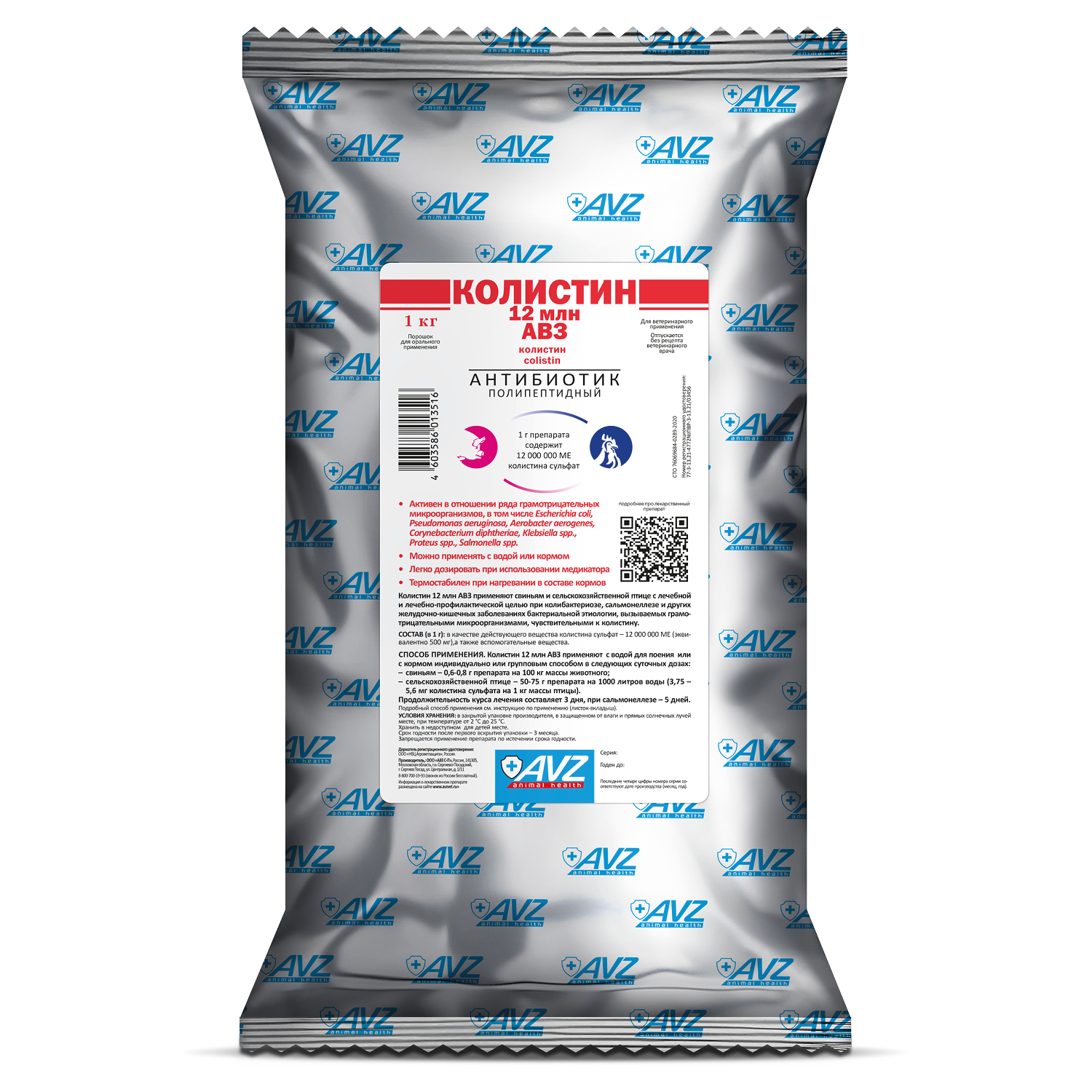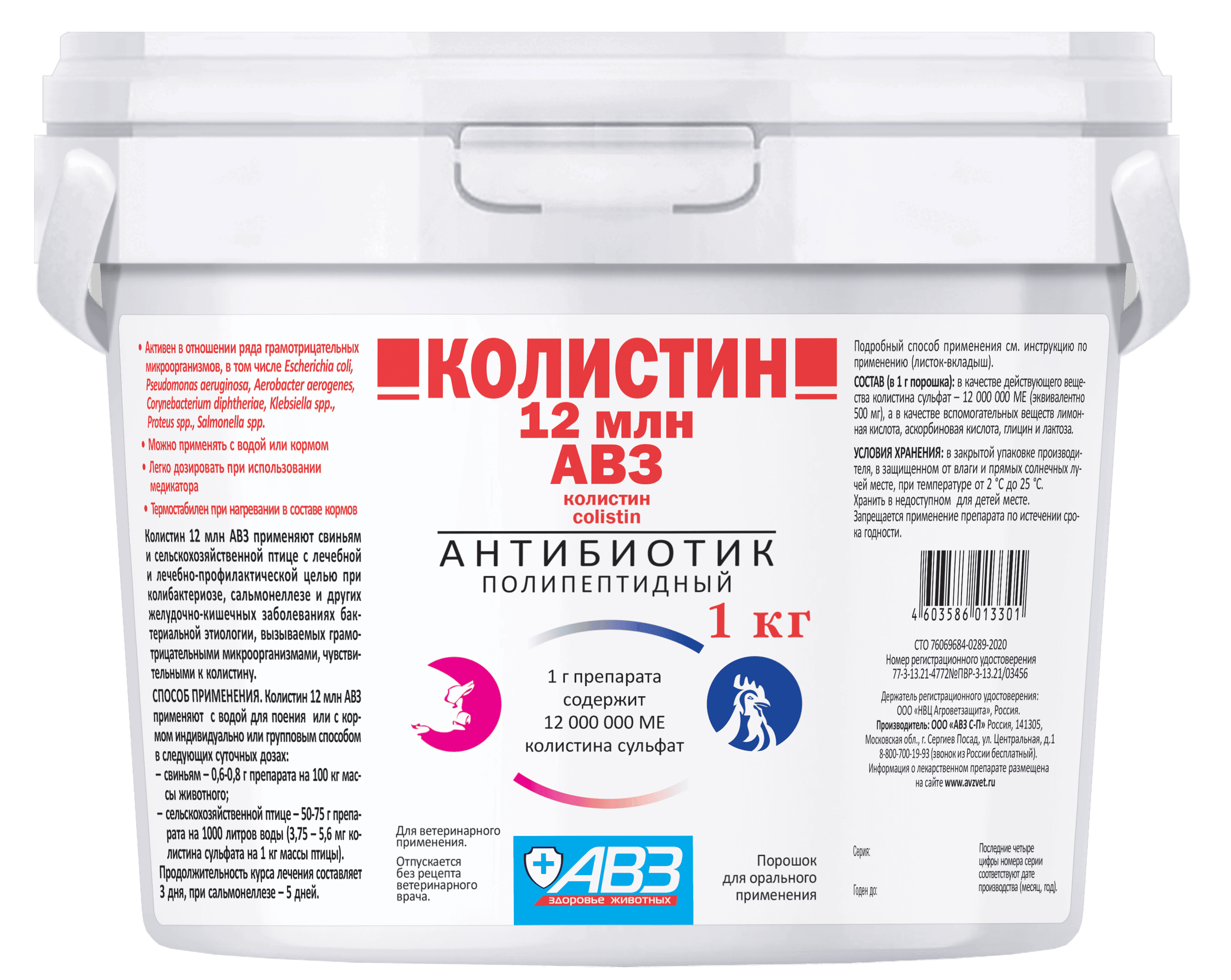 В качестве действующего вещества Колистин 12 млн АВЗ содержит в 1 г: колистина сульфат – 12 000 000 МЕ (эквивалентно 500 мг), а также вспомогательные вещества: аскорбиновая кислота, лимонная кислота, глицин и лактоза. Колистина сульфат, входящий в состав препарата, активен в отношении ряда грамотрицательных микроорганизмов, в том числе Escherichia coli, Pseudomonas aeruginosa, Aerobacter aerogenes, Corynebacterium diphtheriae, Klebsiella spp., Proteus spp., Salmonella spp.