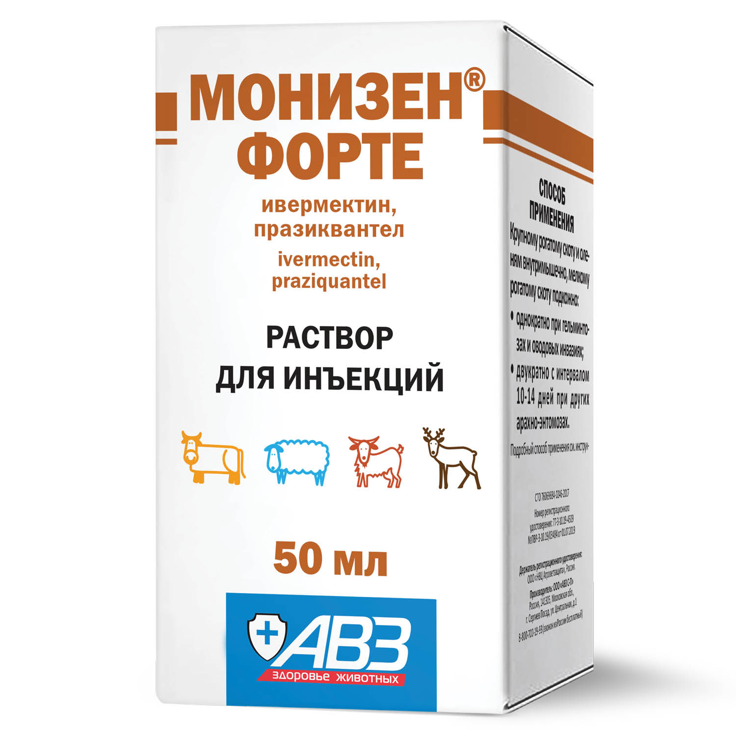 – крупному и мелкому рогатому скоту, оленям при нематодозах легких (диктиокаулез, мюллериоз, цистокаулез, протостронгилидозы) и цестодозах (мониезиоз, авителлиноз, тизаниезиоз) – 1 мл на 20 кг массы животного;