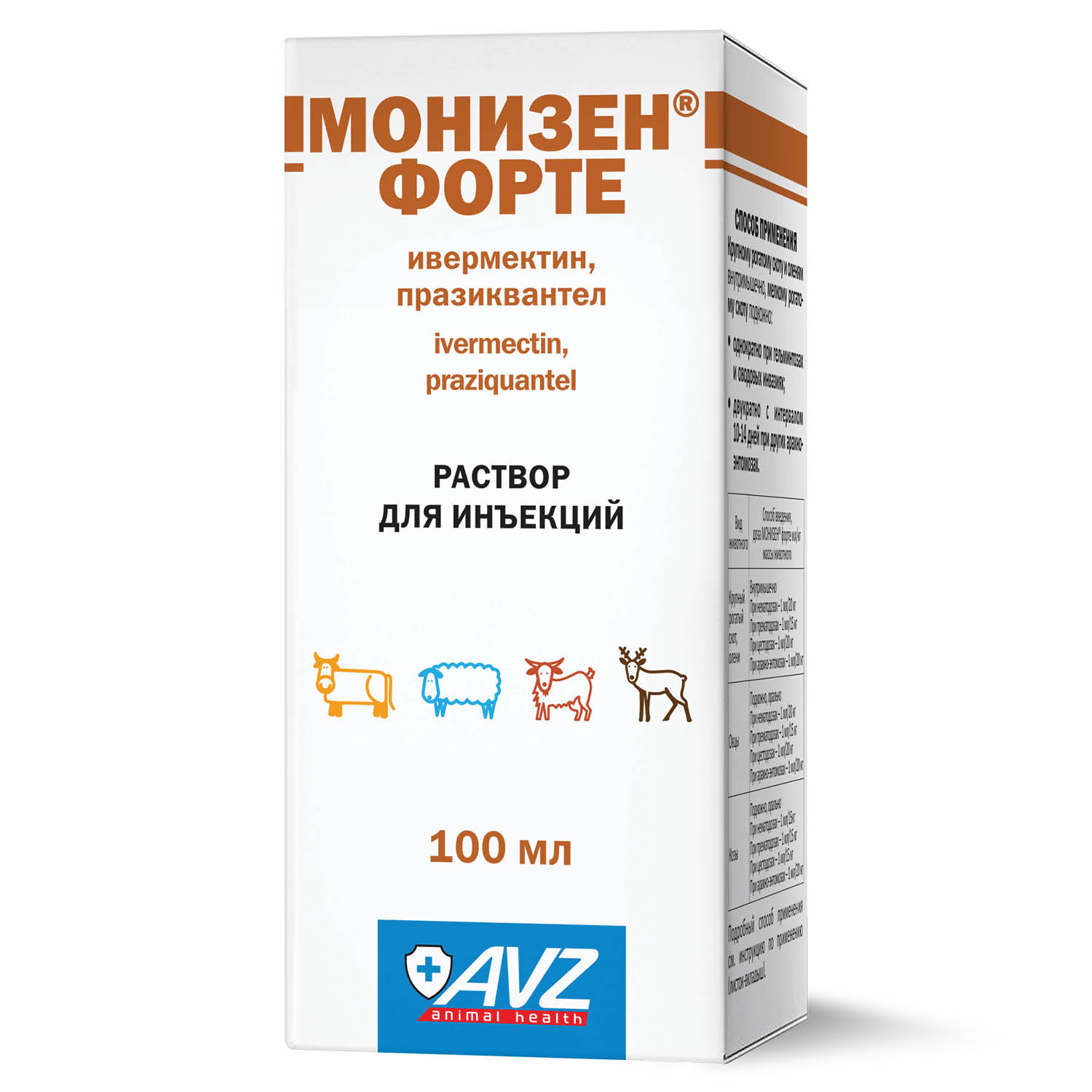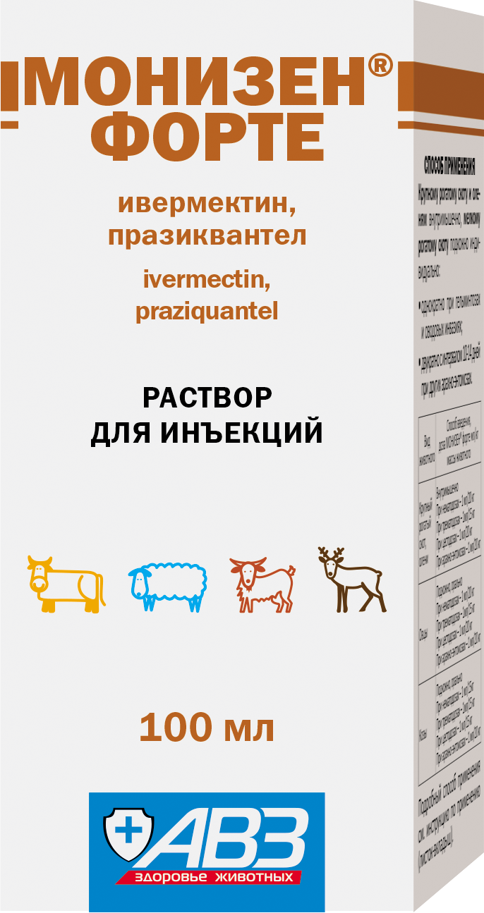 МОНИЗЕН® форте содержит в 1 мл в качестве действующих веществ ивермектин – 5 мг и празиквантел – 60 мг, а в качестве вспомогательных веществ: спирт бензиловый, метилпирролидон и пропиленгликоль.