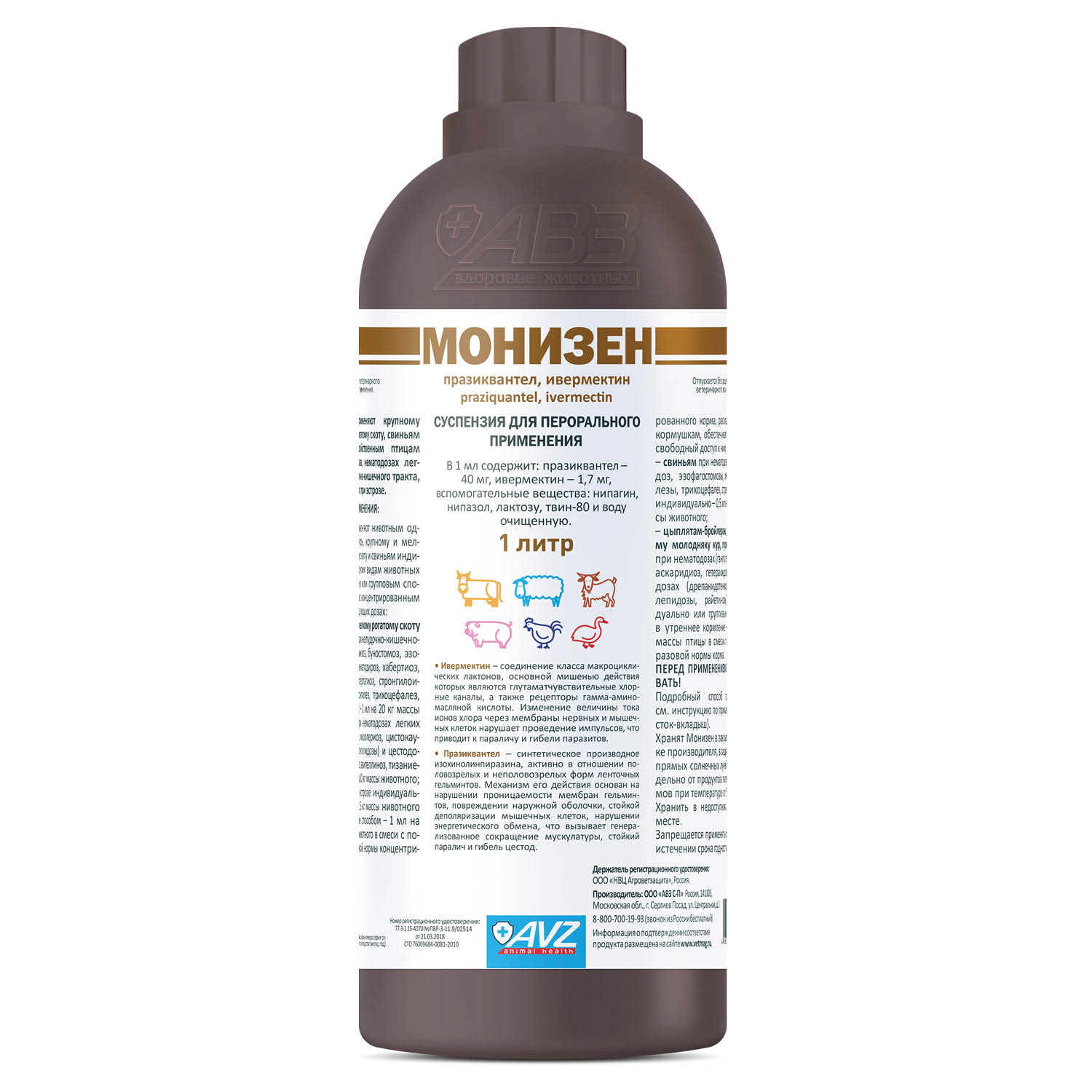 «Монизен» в качестве действующих веществ в 1 мл содержит празиквантел – 40 мг и ивермектин – 1,7 мг, а также вспомогательные вещества.