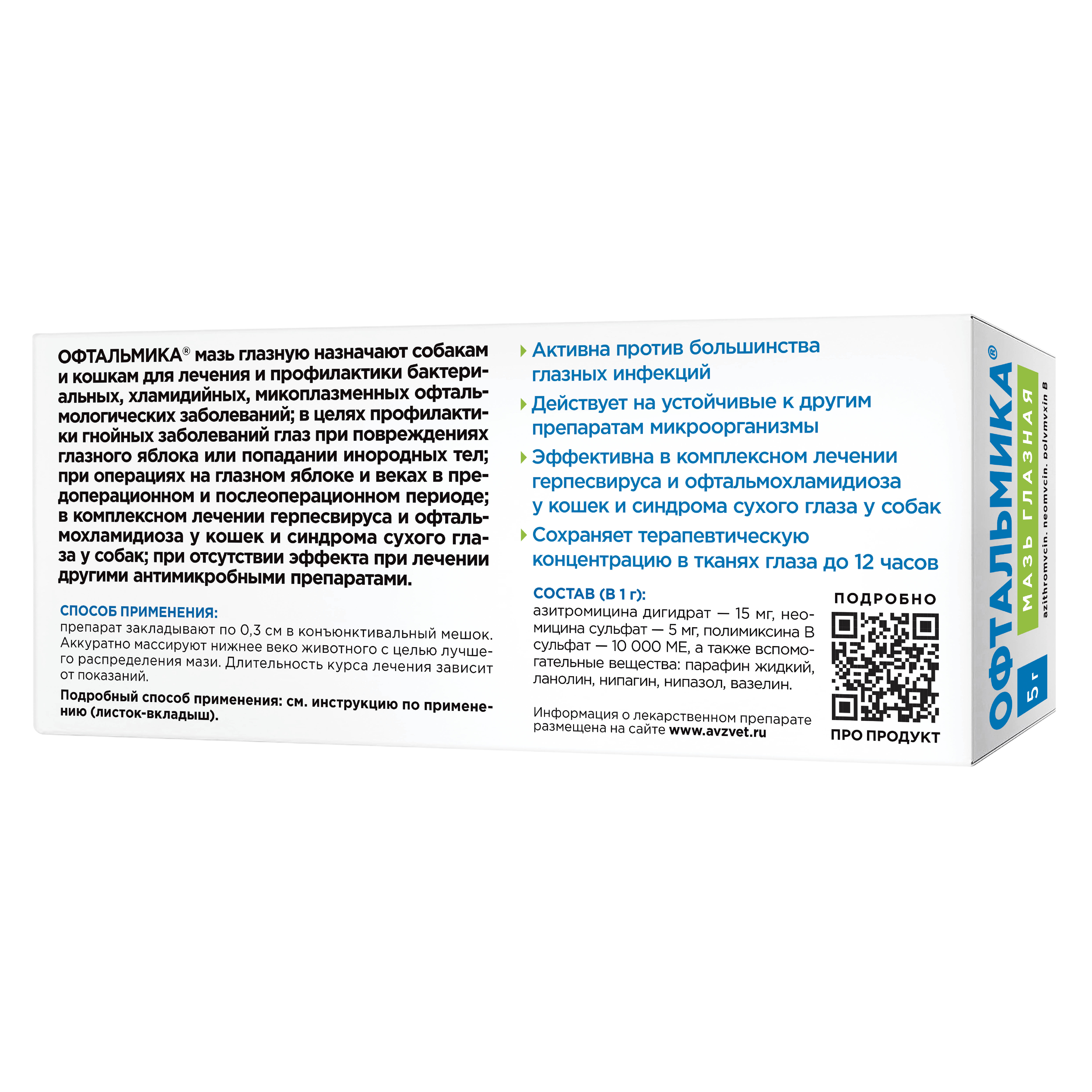 После однократного применения ОФТАЛЬМИКА® мазь глазная действующие вещества проникают в роговицу, ткани века, конъюнктиву и внутриглазную жидкость и сохраняют терапевтические концентрации до 12 часов.
