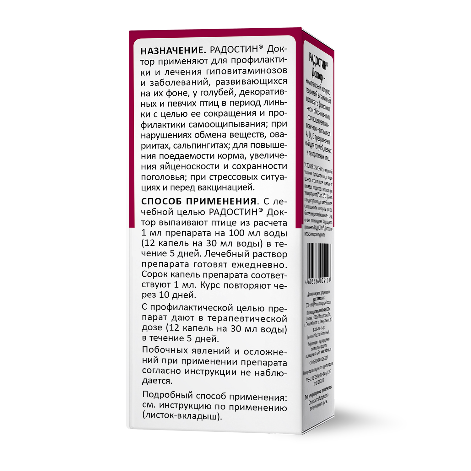 Препарат в качестве действующих веществ содержит: витамин А – 50000 МЕ; витамин D3 – 25000 МЕ; витамин Е – 30 мг, находящиеся в физиологически обоснованных соотношениях.Витамин А обеспечивает нормальный рост и развитие птицы, регулирует обмен веществ, восстанавливает перьевой покров, влияет на устойчивость к стрессовым ситуациям, большинству инфекционных и незаразных заболеваний.