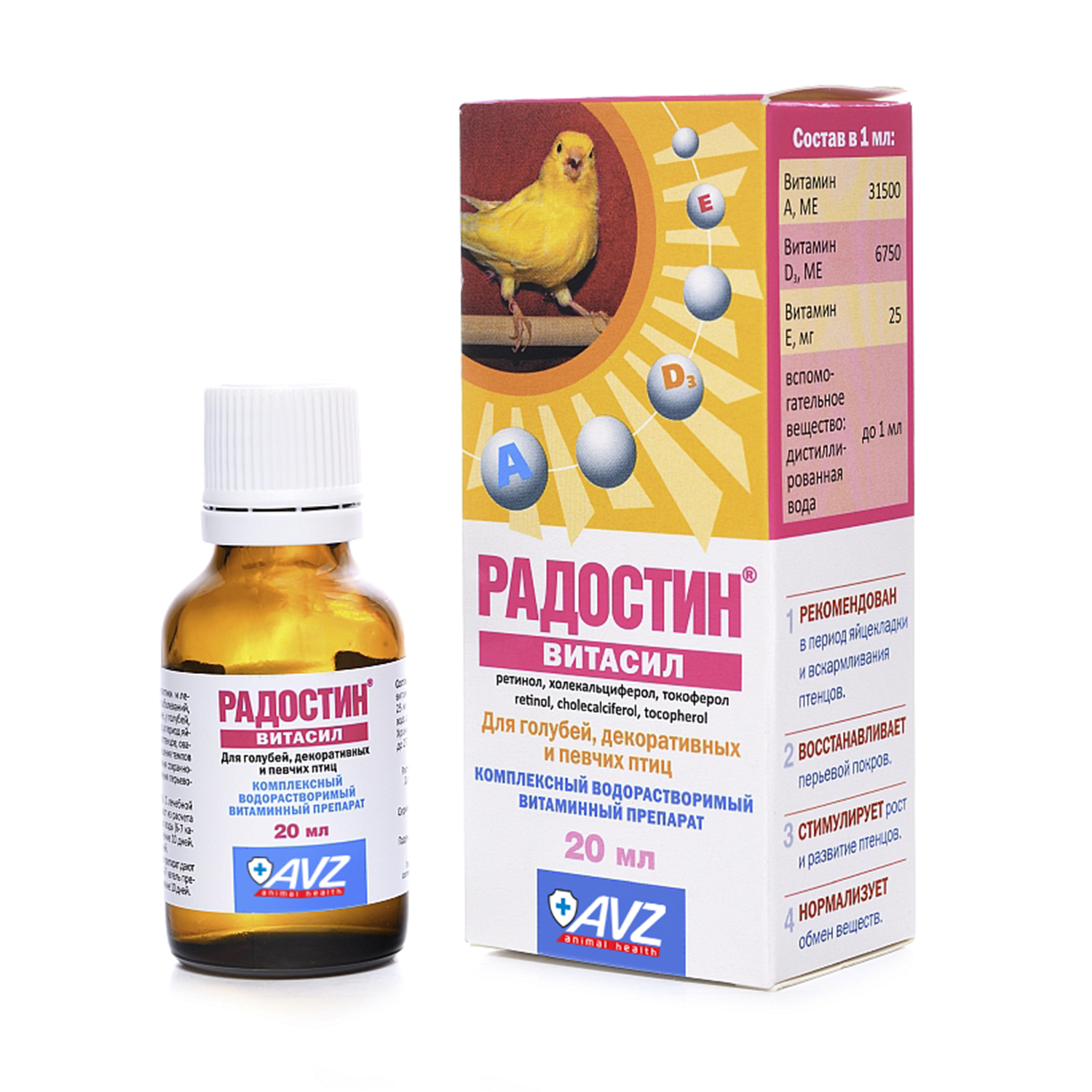 Препарат содержит в качестве действующих веществ: витамин А – 31500 МЕ; витамин D3 – 6750 МЕ; витамин Е – 25 мг, которые находятся в физиологически обоснованных соотношениях.Витамин А обеспечивает нормальный рост и развитие птицы, регулирует обмен веществ, восстанавливает перьевой покров, влияет на устойчивость к стрессовым ситуациям, а также к большинству инфекционных и незаразных заболеваний.