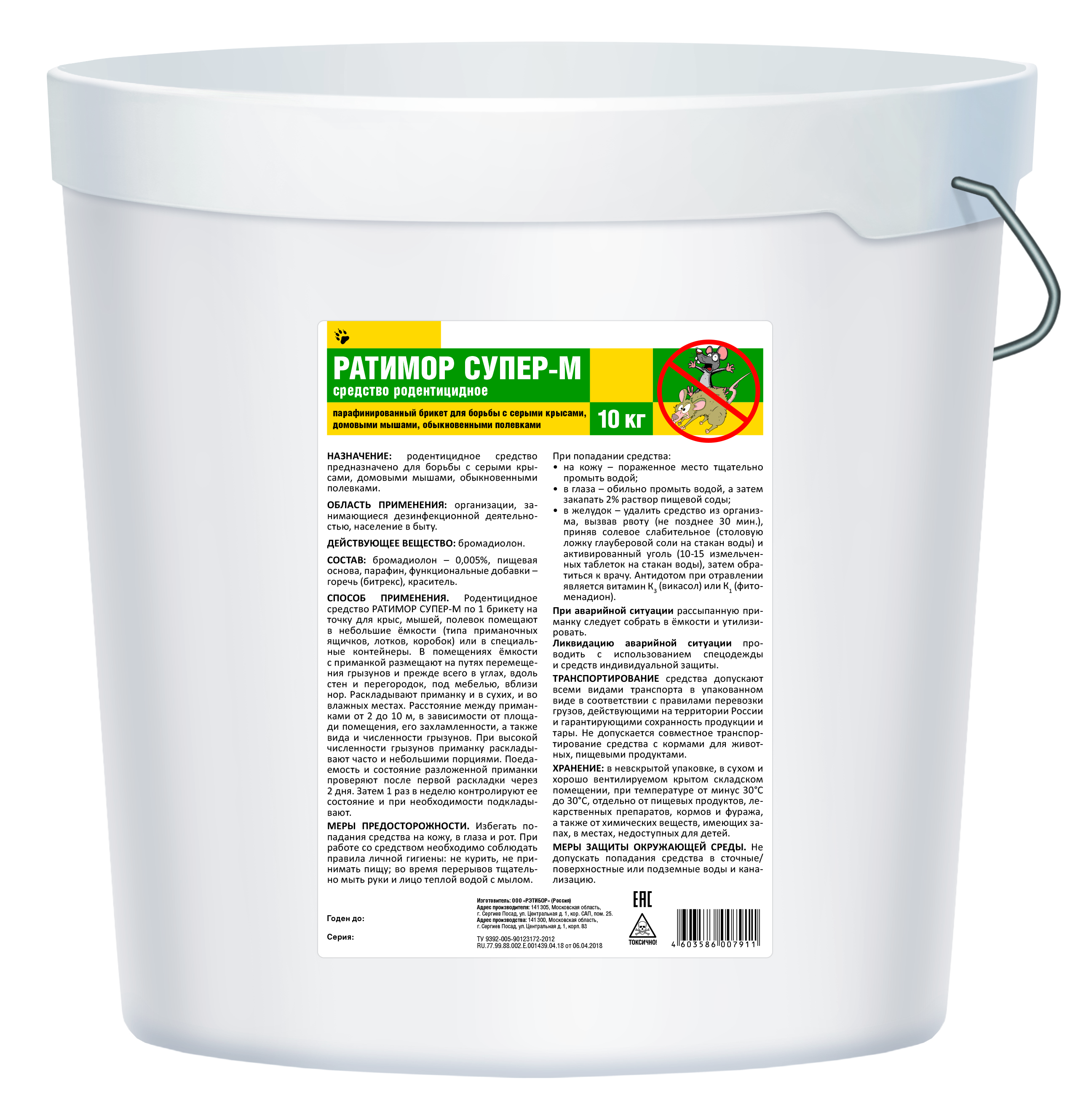 Готовая к применению добавка, предназначенная для борьбы с серыми крысами, домовыми мышами, обыкновенными полевками в жилых помещениях на объектах различных категорий, на открытых участках, примыкающих к застроенным территориям населенного пункта, специалистами организаций занимающихся дезинфекционной деятельностью, а также населением в быту.Содержит в качестве действующего вещества бромадиолон 0,005%.