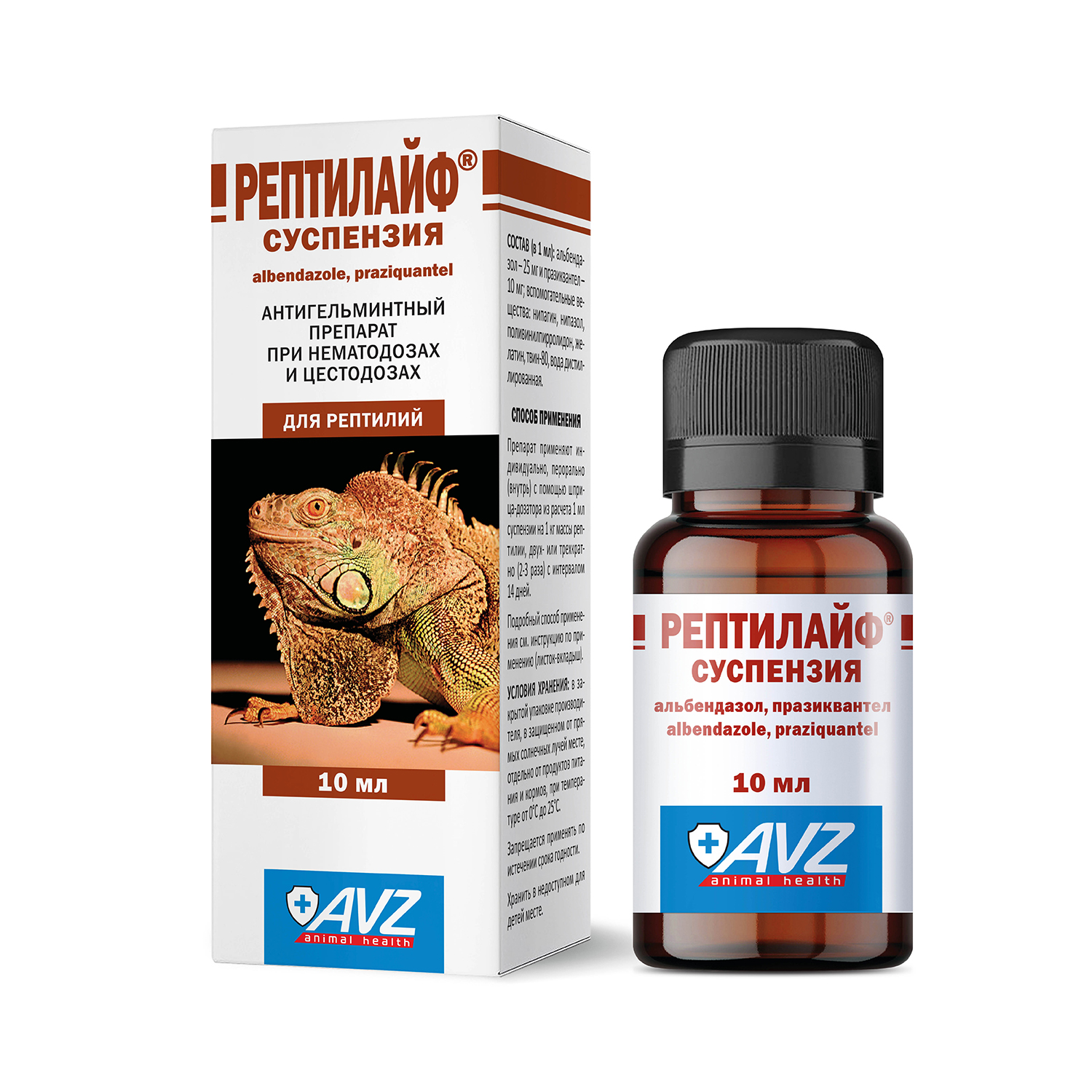 Рептилайф суспензия в качестве действующих веществ в 1 мл содержит альбендазол – 25 мг и празиквантел – 10 мг, а также вспомогательные вещества.