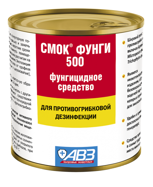 СМОК® фунги применяют для противогрибковой дезинфекции помещений, транспортных средств, кормоцехов , зернохранилищ, подстилки, инкубаторов, шкафов, кормушек, клеток, гнезд, поилок, инженерных коммуникаций в птицеводческих и животноводческих помещениях , кролиководческих фермах, конюшнях и других объектах ветеринарного надзора, обсемененных грибами, включая Aspergillus spp., Trichophyton verrucosum, Т. mentagrophytes, Т. equinum , Microsporum canis, М gypseum.