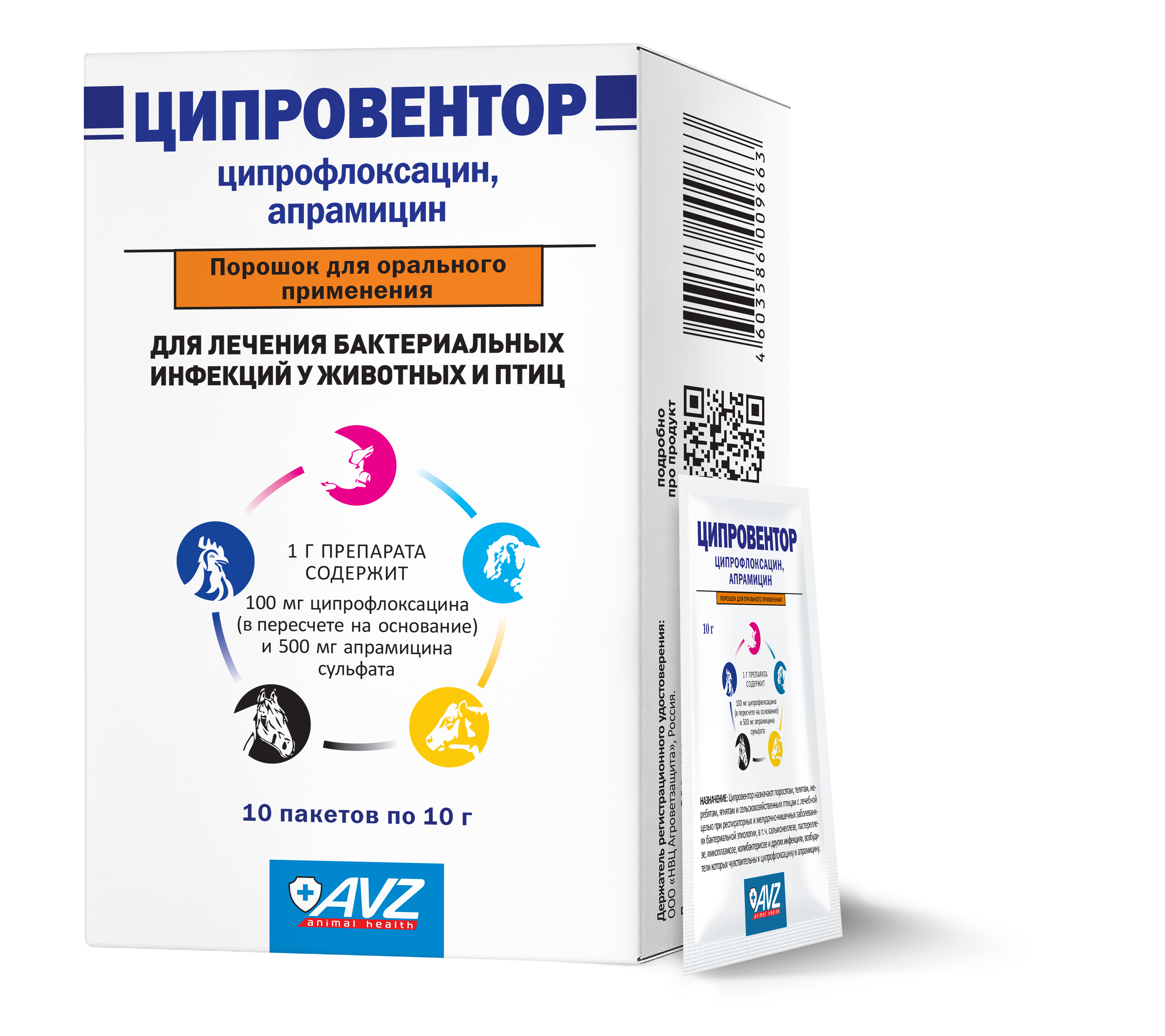 Выводится ципрофлоксацин из организма в основном в неизменном виде и частично в форме метаболитов с мочой и желчью. Апрамицин не подвергается биотрансформации в организме животных и после перорального введения выводится в неизмененном активном виде, преимущественно с калом и частично - с мочой.
