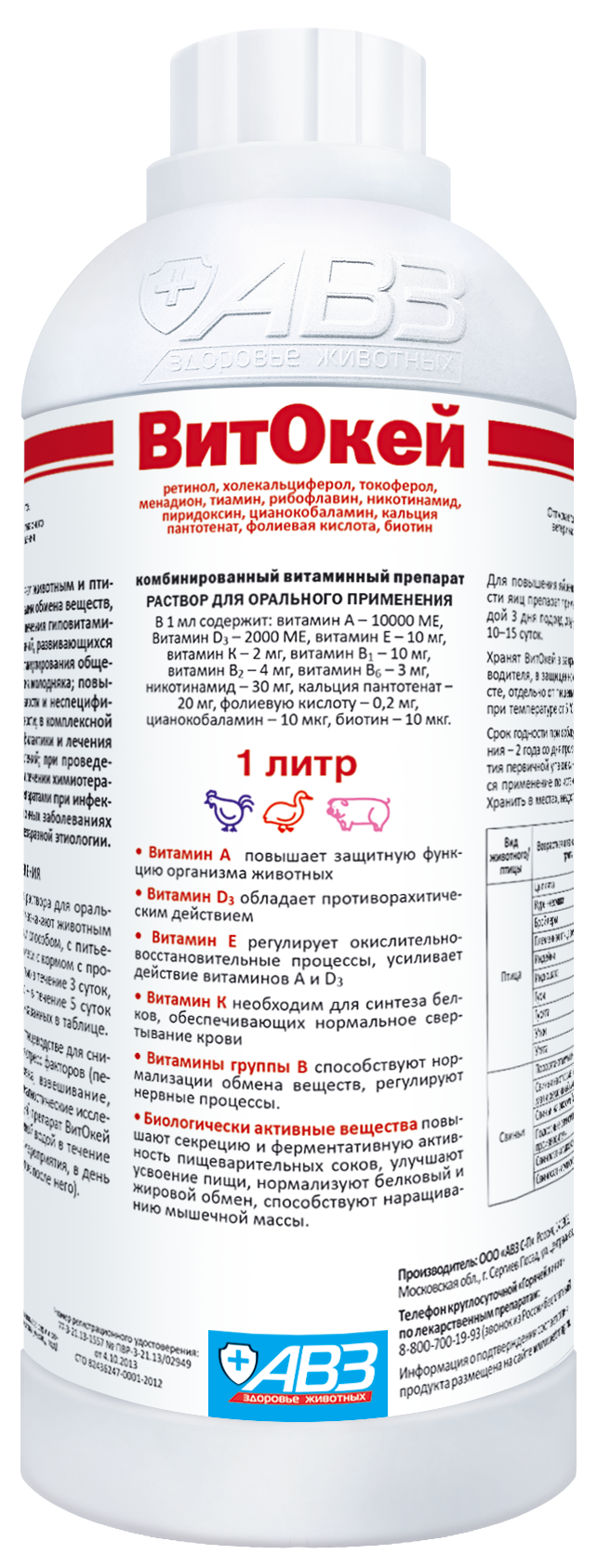 "ВитОкей" относится к комбинированным витаминным препаратам. Активные вещества препарата оказывают синергидное действие на организм животных и птиц, выражающееся в нормализации обмена веществ, профилактике гиповитаминозов и заболеваний, развивающихся на их фоне.