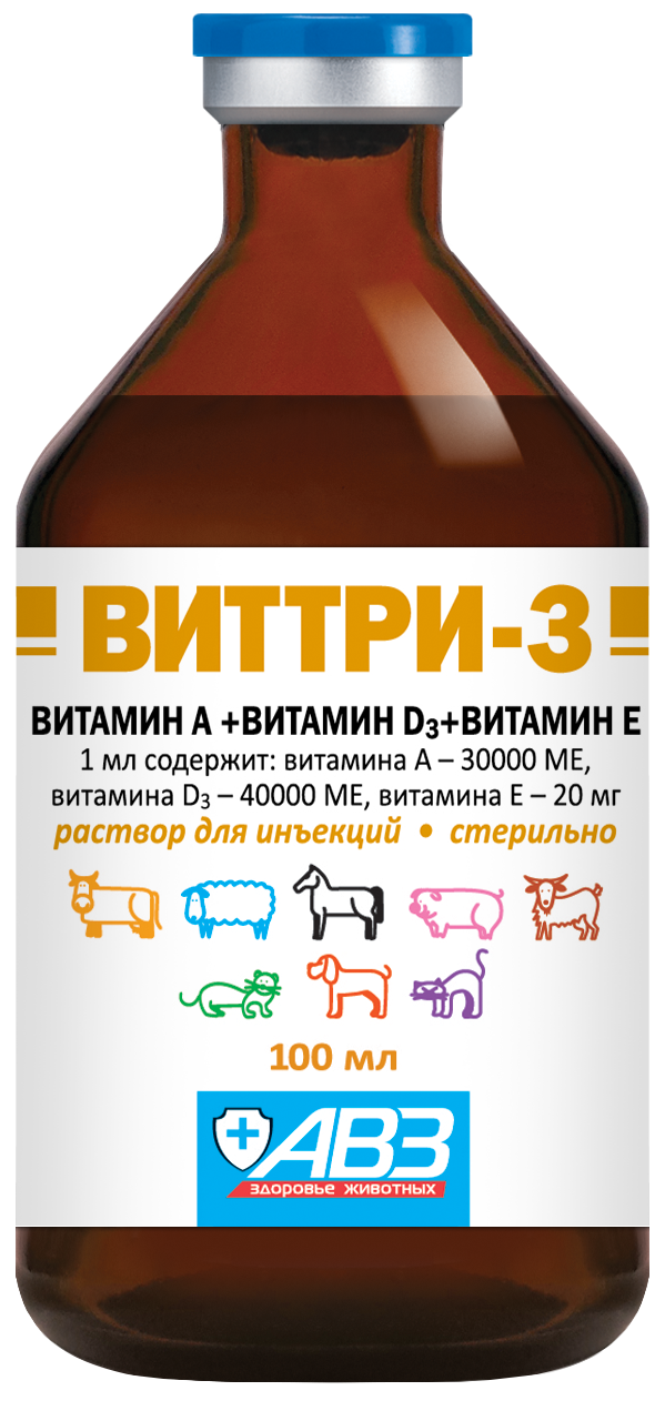 Виттри-3 раствор для инъекций содержит в (1 мл) витамин А – 30 000 МЕ, витамин D3 – 40 000 МЕ, витамин Е – 20 мг, и также вспомогательное вещество – растительное масло.