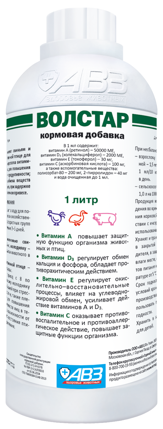 "Волстар" восполняет недостаток витаминов в организме свиней и сельскохозяйственной птицы, обладает комплексным действием, направленным на улучшение продуктивности при интенсивном животноводстве и птицеводстве, повышает защитные функции организма. Витамин А регулирует функцию и регенерацию эпителиальных тканей и тем самым повышает сопротивляемость против инфекции. Витамин D3 регулирует обмен кальция и фосфора и влияет на их всасывание в желудочно-кишечном тракте, обладает противорахитическим действием. Витамин Е регулирует окислительно-восстановительные процессы и влияет на углеводно-жировой обмен, усиливает действие витаминов А и D3. Витамин С является важным фактором нормального роста и повышает защитные функции организма.